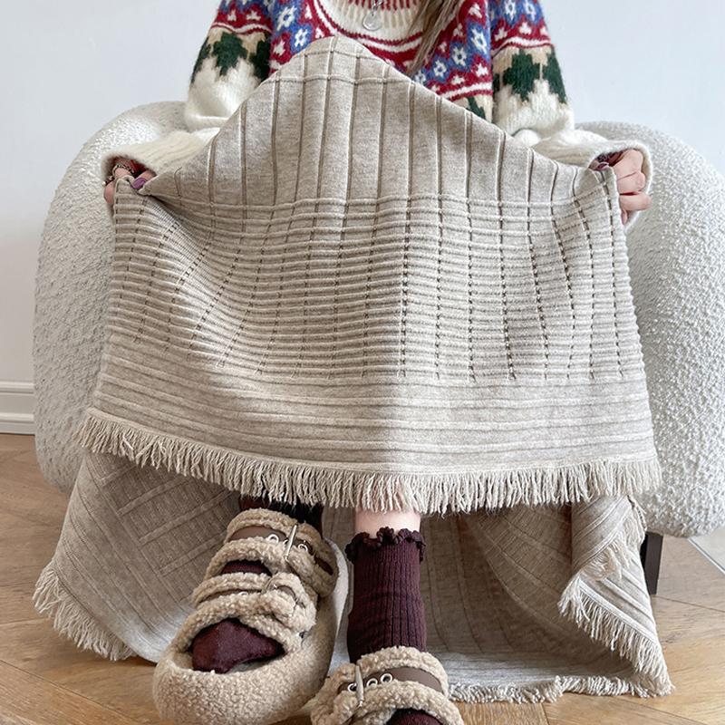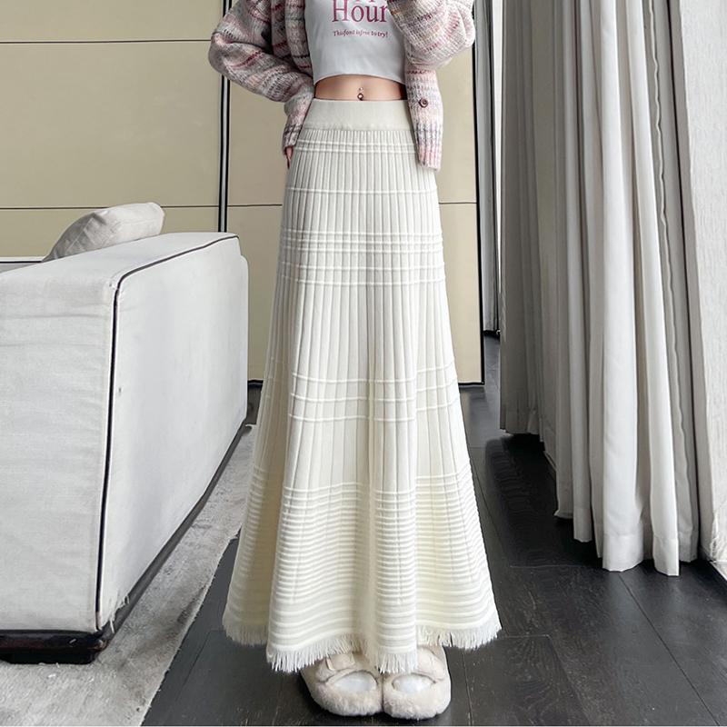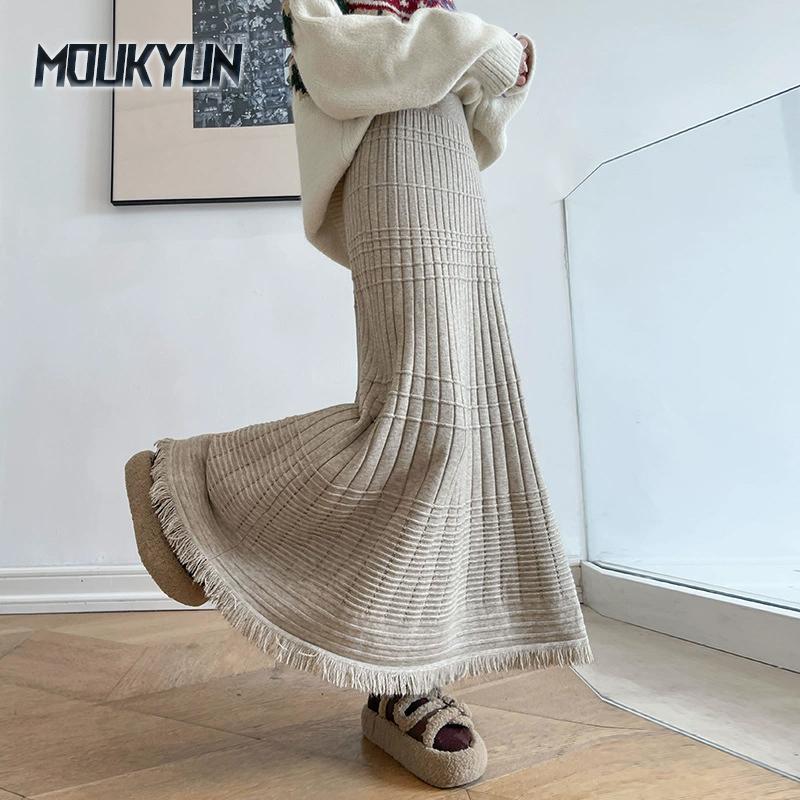 Корейская Мода Осень Зима Женская Миди Теплая Юбка Высокая Талия Бежевый Черный Хаки Вязаная Юбка Кисточка Русалка Вязаные Плотные Юбки