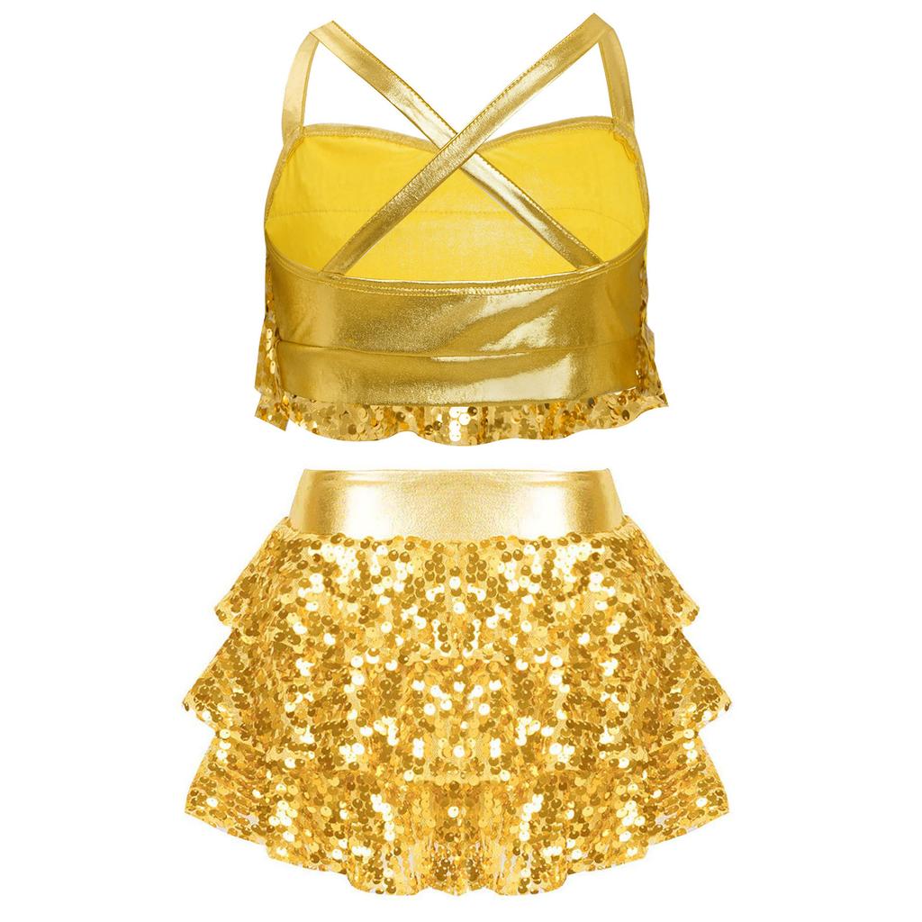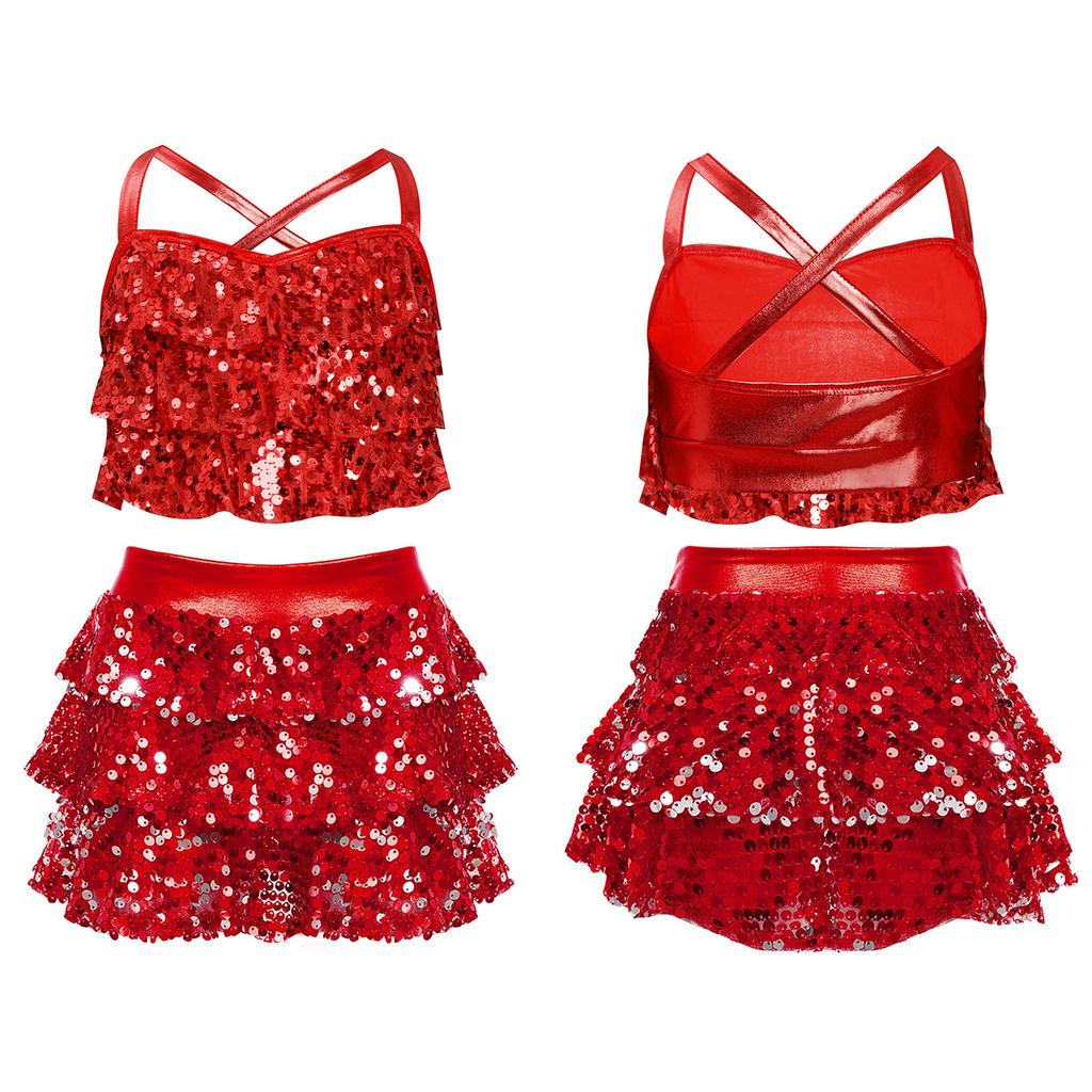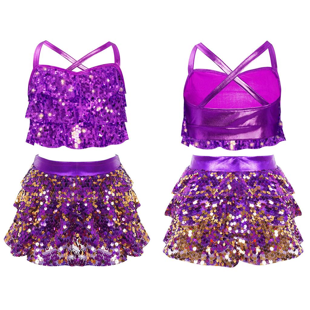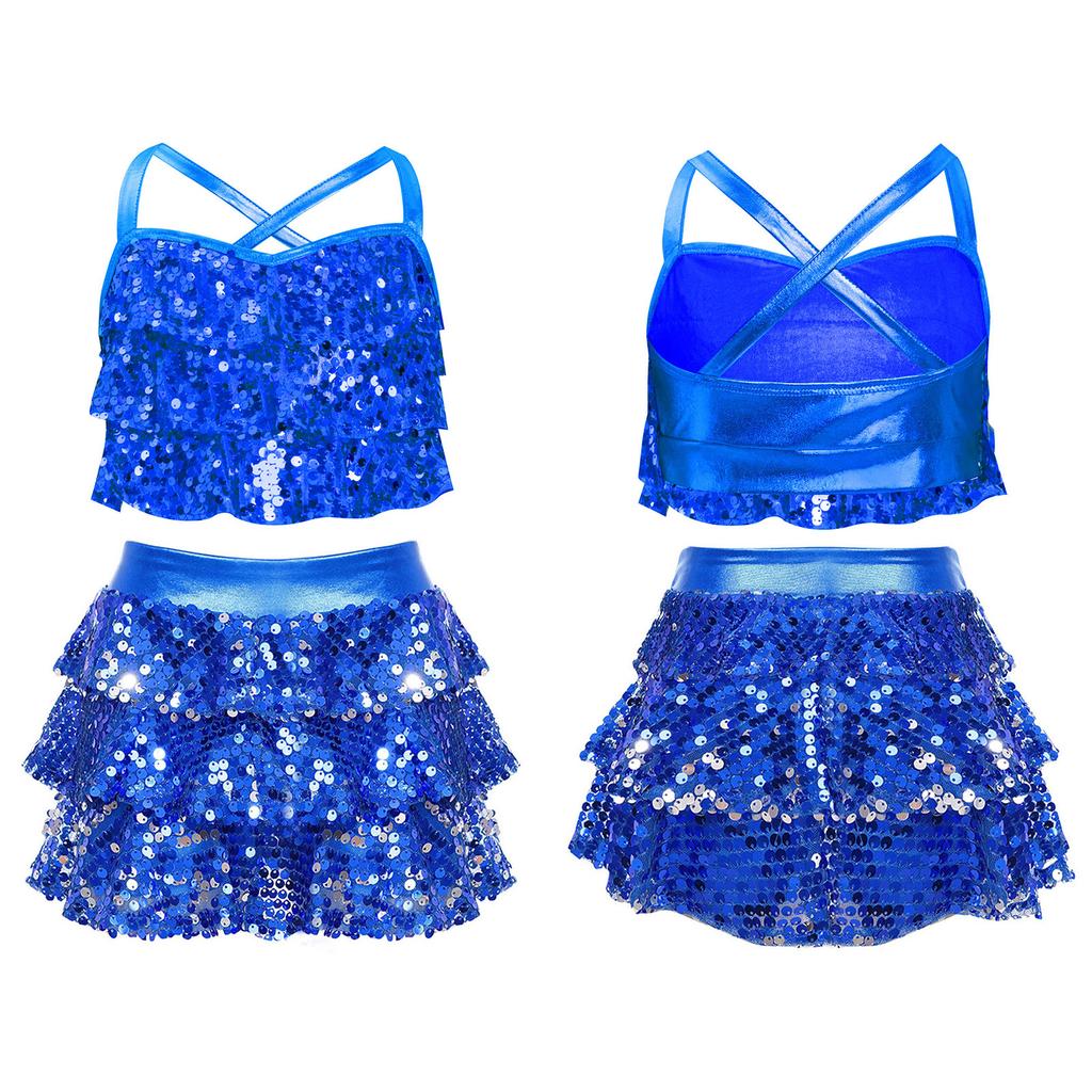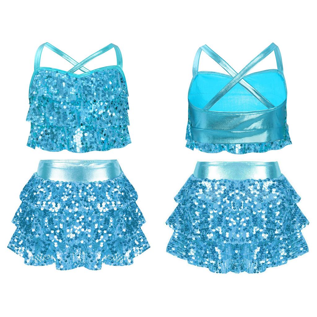 Детские костюмы для джаза и латиноамериканских танцев из двух частей: блестящий топ-камезоль с пайетками и юбка. Бальные танцевальные костюмы.