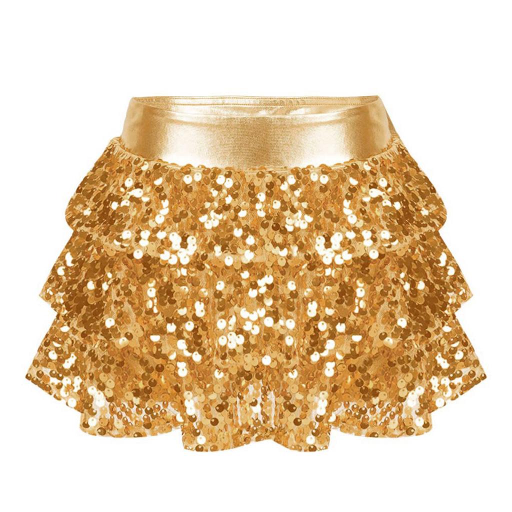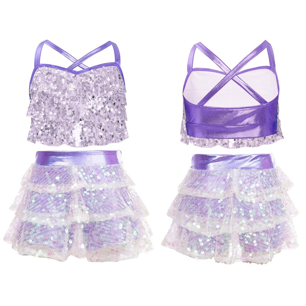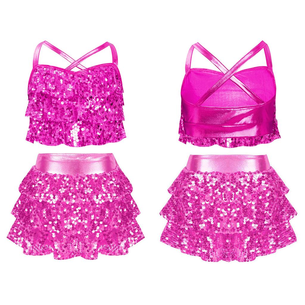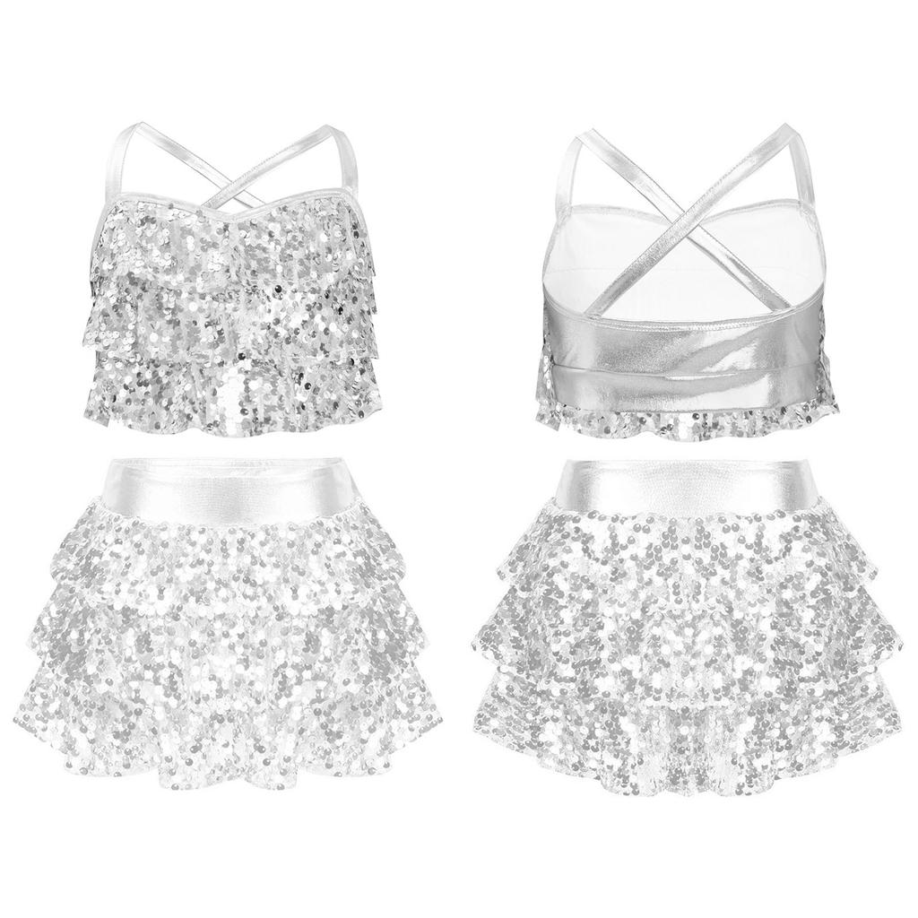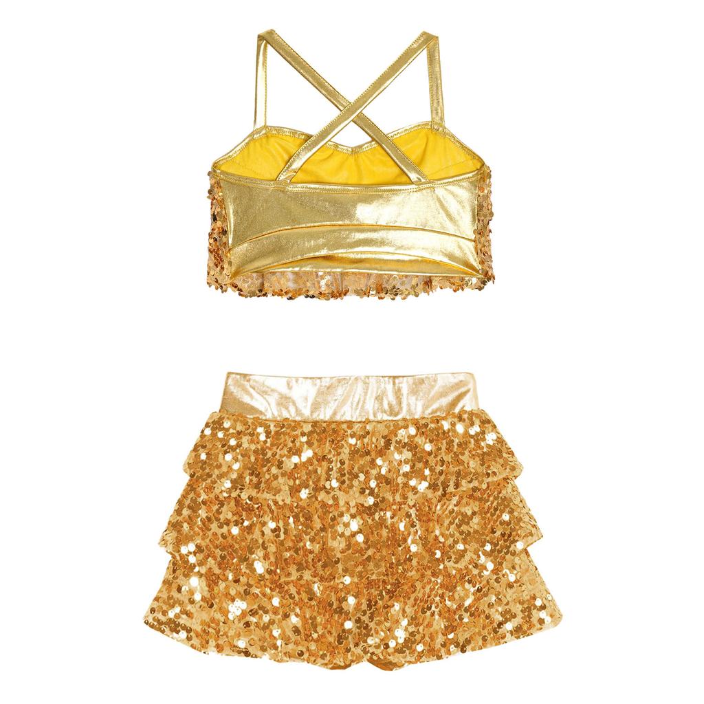 Детские костюмы для джаза и латиноамериканских танцев из двух частей: блестящий топ-камезоль с пайетками и юбка. Бальные танцевальные костюмы.