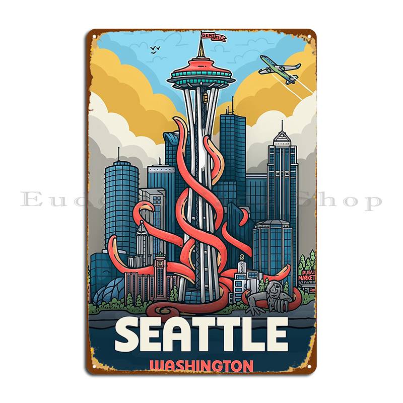Сиэтл Спейс Нидл Кракен Бриллиант Металлическая Табличка Гараж Клуб Дизайн Настенный Декор Изготовленный на заказ Жестяной Знак Постер