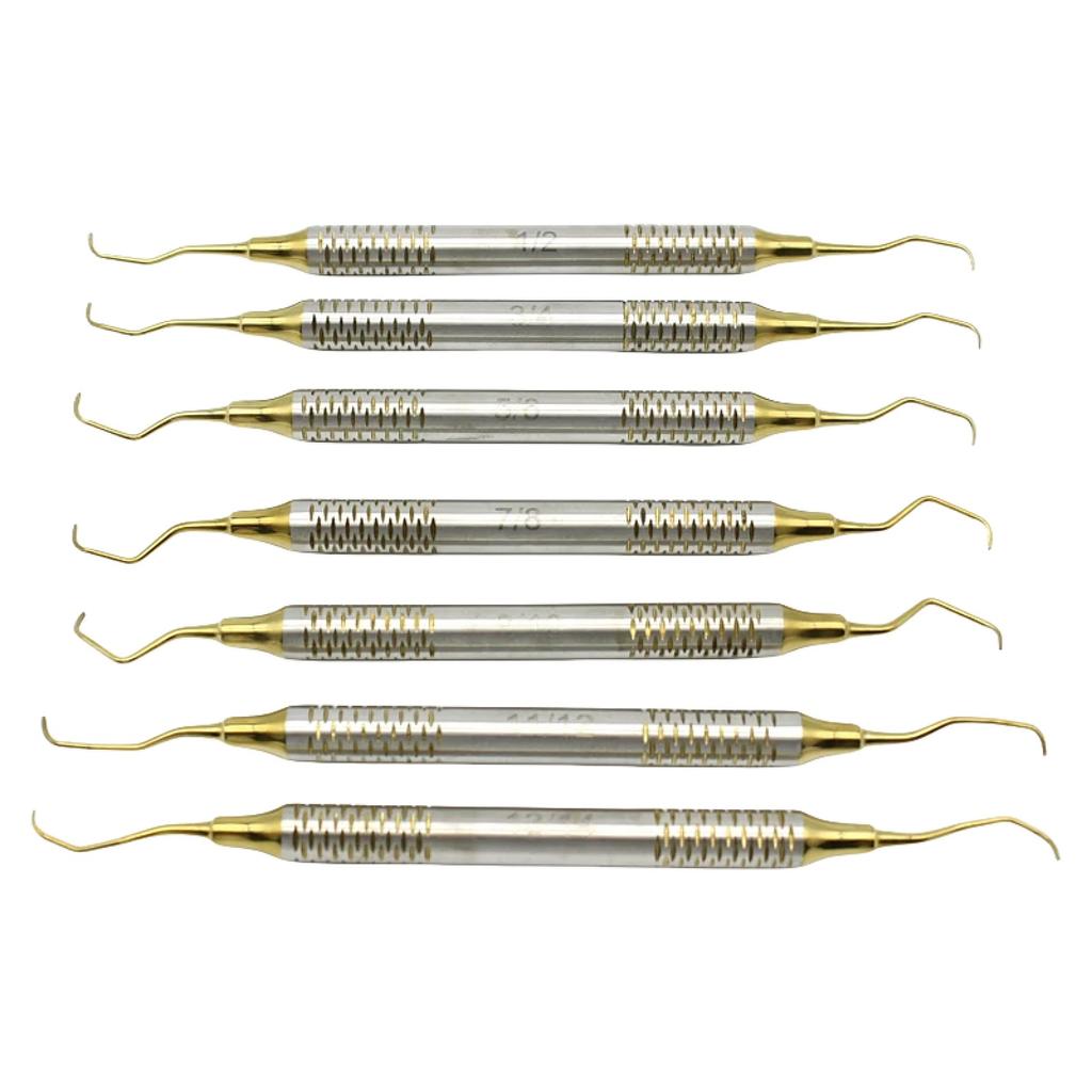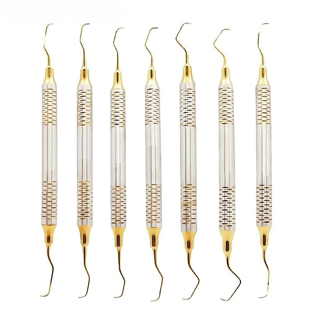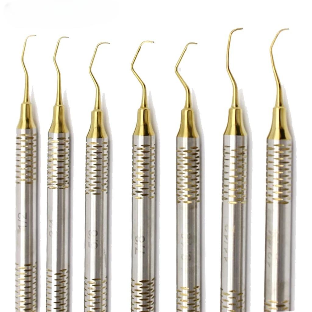 Набор ручных скейлеров для чистки зубов, 7 шт., Пародонтальные кюреты Грейси для кости, Периодонтальные скейлеры, Золотая нержавеющая сталь, Инструмент для отбеливания и ухода за полостью рта, спецификацииназвание продукта: Стоматологический ручной набор скейлеров для чистки зубов (Включая кюретки Грейси)Количество: 7 шт./Наборматериал:Нержавеющая сталь с уникально обработанным титановым цветным покрытием: Типы Goldtool:Перио Скейлеры,Кюретки ГрейсиДизайн рукоятки:Рукоятка с полостью и эксклюзивной кольцевой текстуройметод стерилизации: Автоклавируемое состояние: 100% Абсолютно новый и высококачественныйключевые особенностивысококачественный материал: Изготовлено из премиальной нержавеющей стали с коррозионной стойкостью и долговечностью, долгий срок службы и совместимо со стерилизацией при высокой температуре, двухсторонний дизайн: Инструменты двусторонние, с разными формами на обоих концах, подходят для различных задач по очистке, легко добираются до труднодоступных мест, удобный захват: Рукоятка с полостью, умеренного диаметра и кольцевой текстурой, обеспечивает надежный захват, снижает усталость рук и гарантирует гибкое управление. Точная и эффективная.: Тонко отточенные режущие кромки с оптимальной остротой для быстрого и эффективного удаления зубного налета, зубного камня и других отложений безопасны и не царапают: Титановая обработанная поверхность предотвращает царапание зубов и десен, балансируя очищающий эффект и безопасность. Применение: пародонтологическое лечение.: Используется для удаления зубного камня и налета у пациентов с заболеваниями пародонта, поддержания здоровья пародонта, ежедневного ухода за полостью рта: Помогает в профессиональной чистке полости рта, улучшает чистоту зубов и способствует их отбеливанию.стоматологический клинический диагноз: Подходит для операций по чистке и снятию зубного камня в стоматологических клиниках и отделениях стоматологии больниц. Основной диагностический инструмент, стоматологическое обучение и тренировка.: Для студентов-стоматологов для практики техник ручной чистки зубов и скейлинга, ознакомления с различными инструментами, руководство по использованию инструментов, выбор инструментов: Выбирайте соответствующие инструменты в зависимости от зон очистки, такие как кюреты Грейси для глубоких пародонтальных карманов и обычные скейлеры для поверхностей зубов.: Перед использованием проверьте состояние режущих кромок инструмента. Поддерживайте правильный угол во время работы. Избегайте чрезмерного усилия, чтобы не повредить десны. Чистка и обслуживание.: Удаляйте остаточные пятна сразу после использования. Храните после стерилизации под высоким давлением. Держите инструменты в чистоте. Способ хранения.: Классифицируйте 7 инструментов в специальный инструментальный ящик, чтобы избежать столкновения кромок и повреждений.примечанияЭтот продукт является профессиональным стоматологическим инструментом только для медицинского персонала. Непрофессионалам запрещено несанкционированное использование.контролируйте силу во время работы, чтобы предотвратить царапание десен или структуры зуба.следуйте спецификациям оборудования по температуре стерилизации, чтобы избежать высокотемпературного повреждения производительности инструмен
