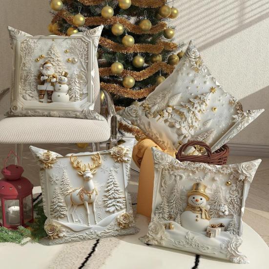 Украсьте свой праздничный декор этой изысканной наволочкой для декоративной подушки. Изготовленный из высококачественной полиэфирной ткани, этот чехол мягкий, прочный и легко чистится для длительного использования.. Элегантный рождественский тематический узор включает Санта-Клауса, снеговика, заснеженную рождественскую елку, золотого оленя и элементы кедра, создавая теплую праздничную атмосферу..