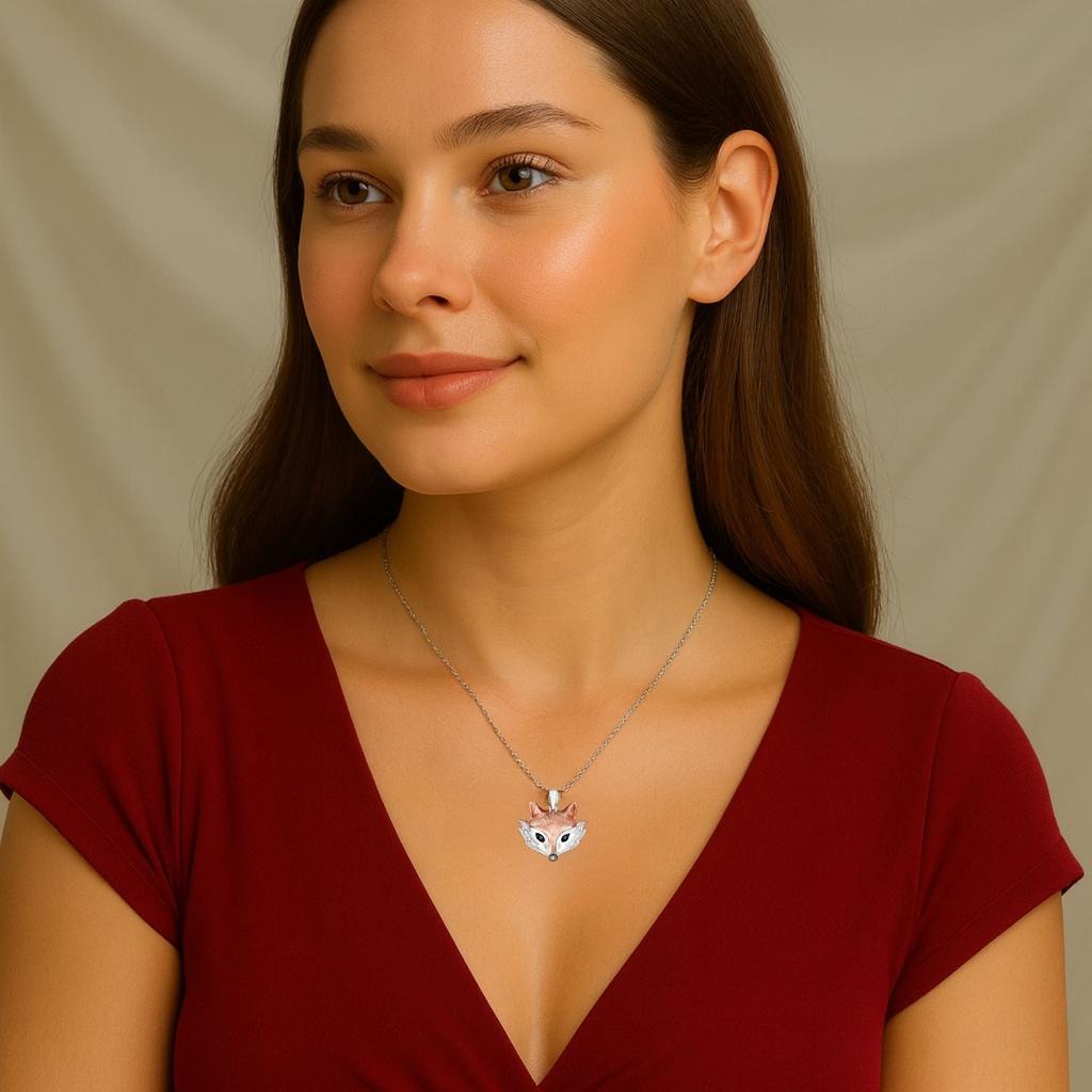 Whimsical sterling silver fox pendant with 0.95 ct blue sapphire eyes and rose gold accents. A playful statement for animal lovers.