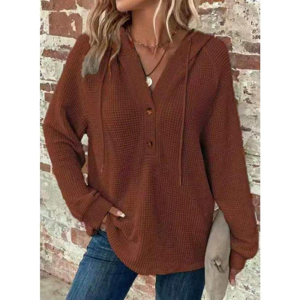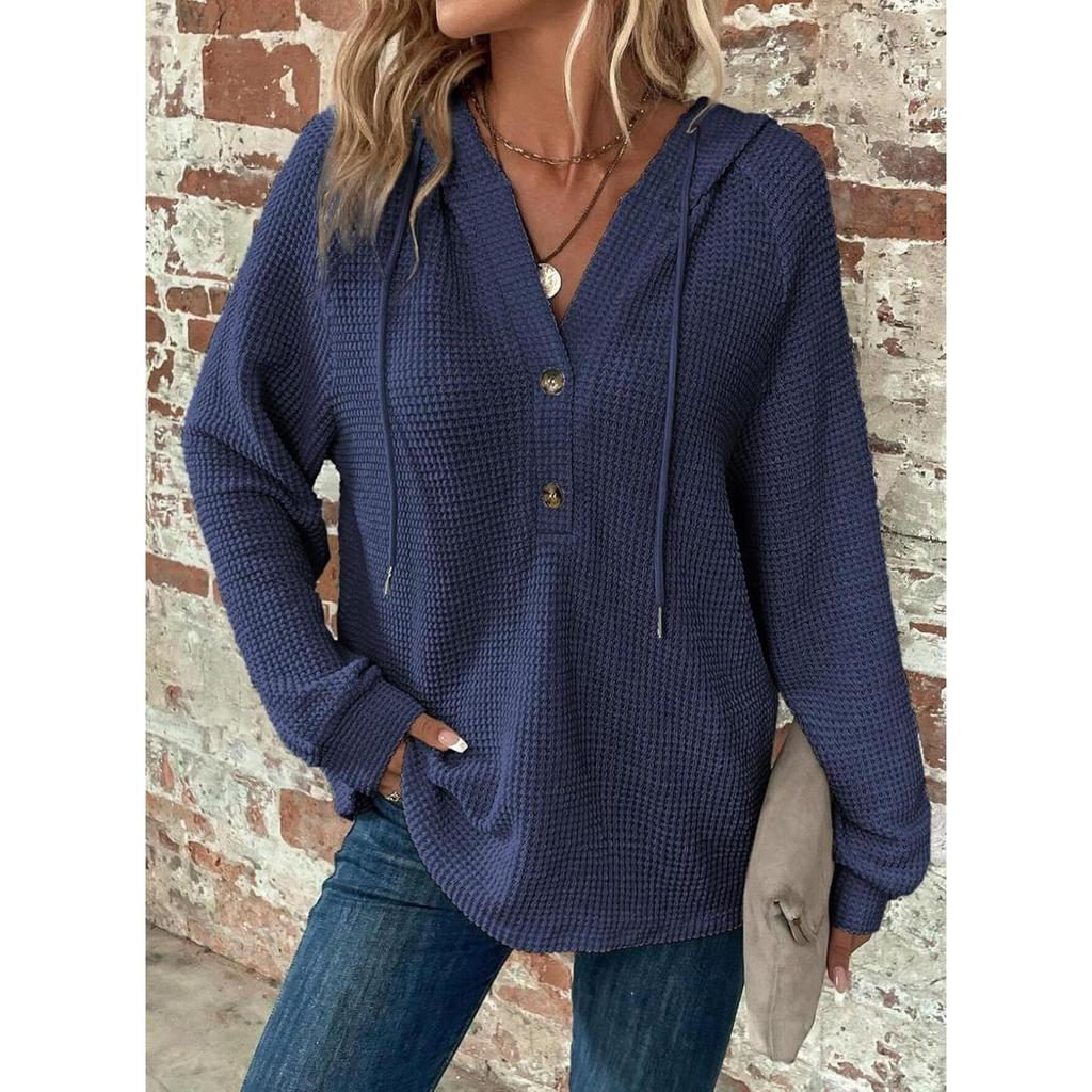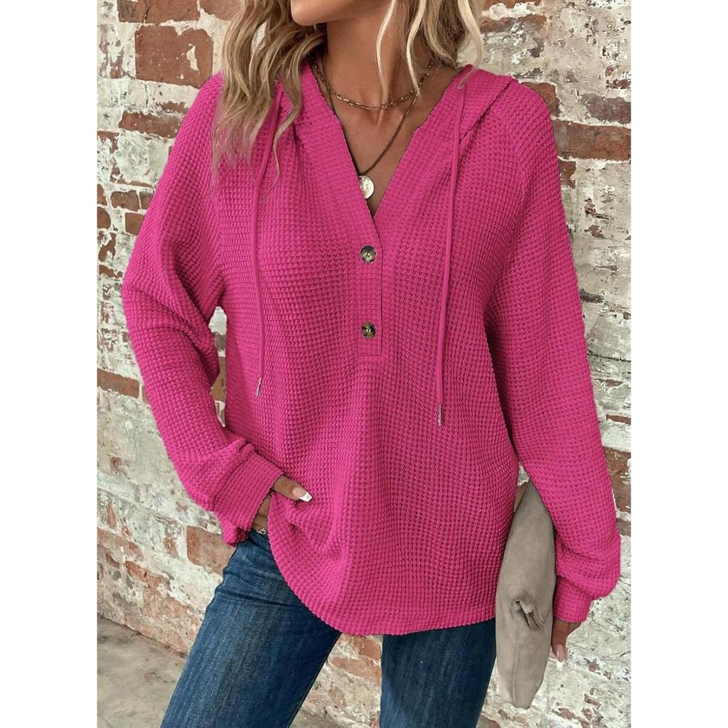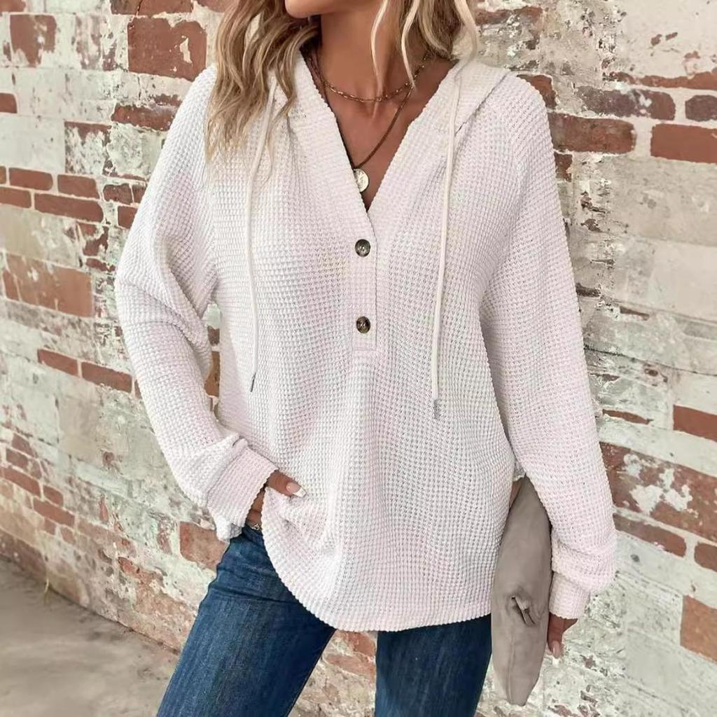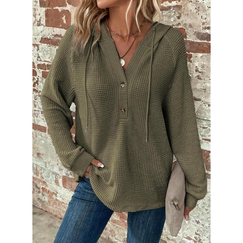 Женские толстовки, вафли, трикотаж, на кулиске, V-образный вырез на пуговицах, длинные рукава, пуловеры, повседневные, спортивные толстовки