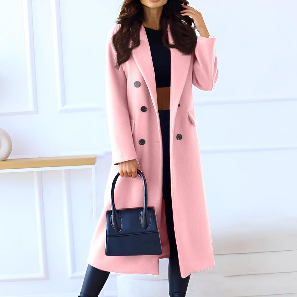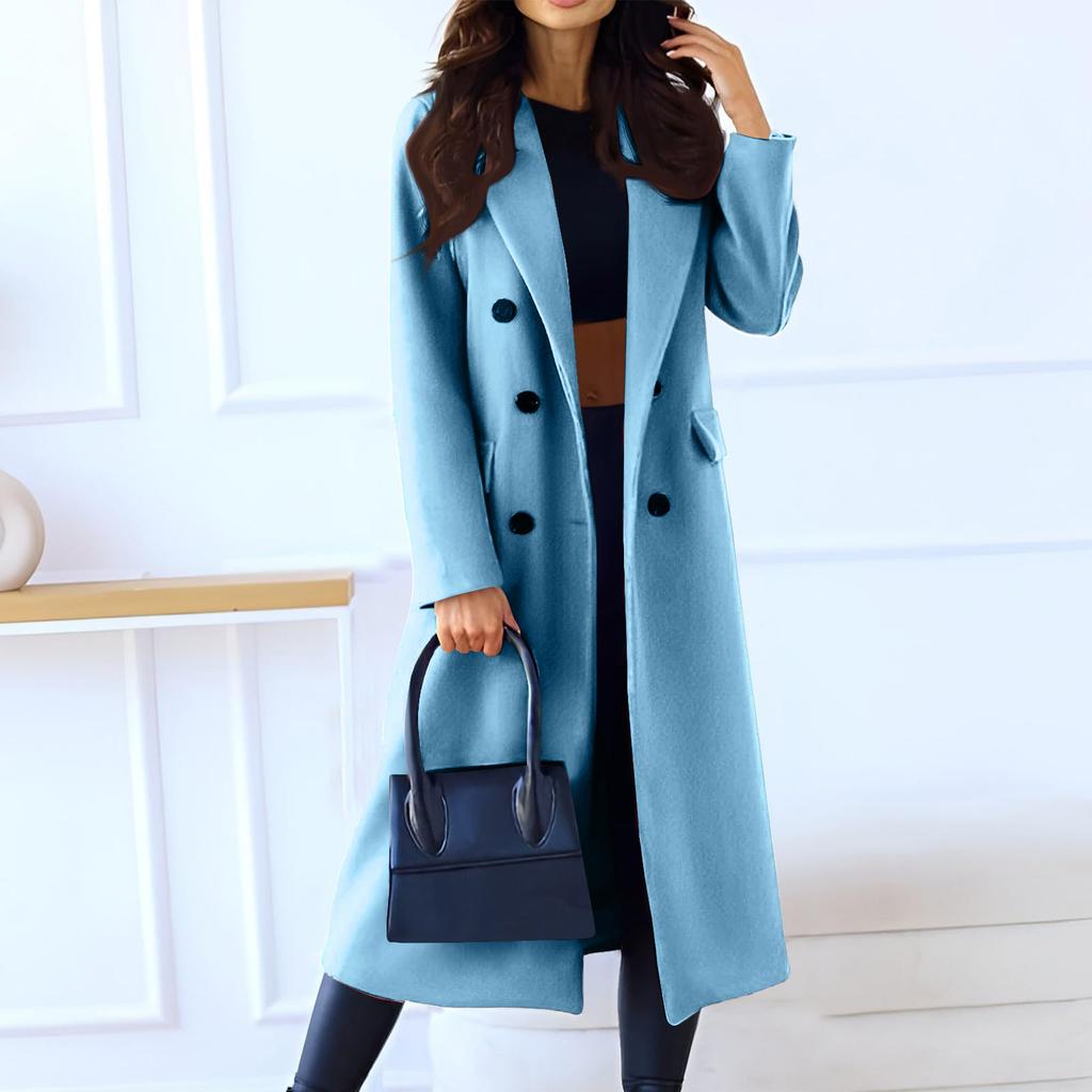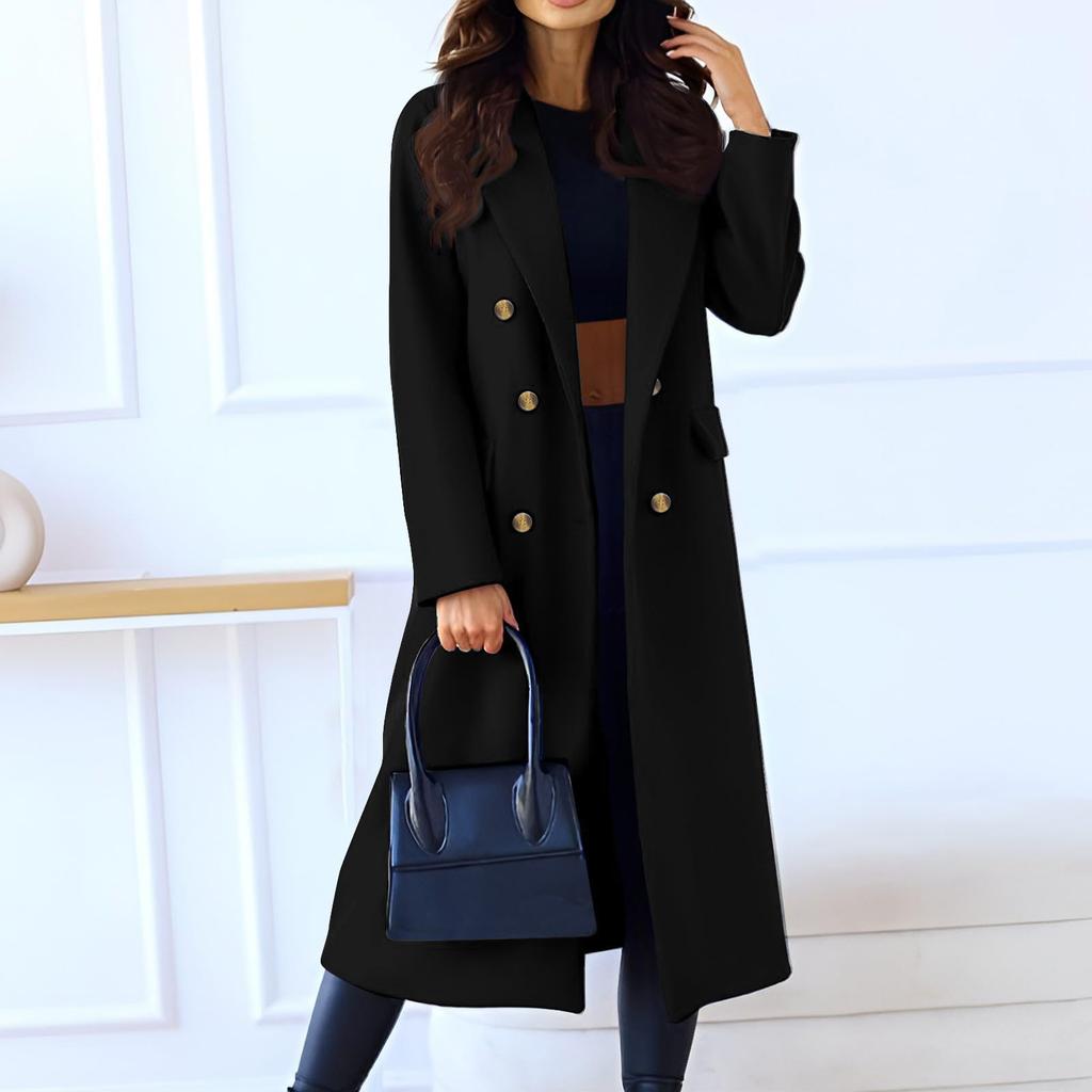 Женское модное повседневное длинное двубортное пальто однотонной расцветки из шерсти
