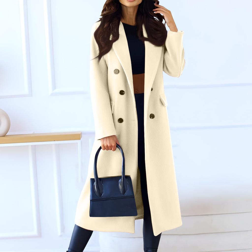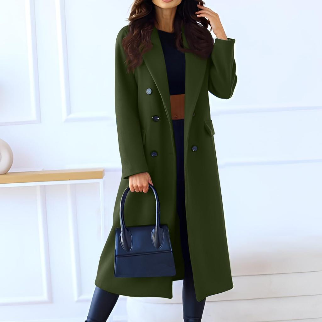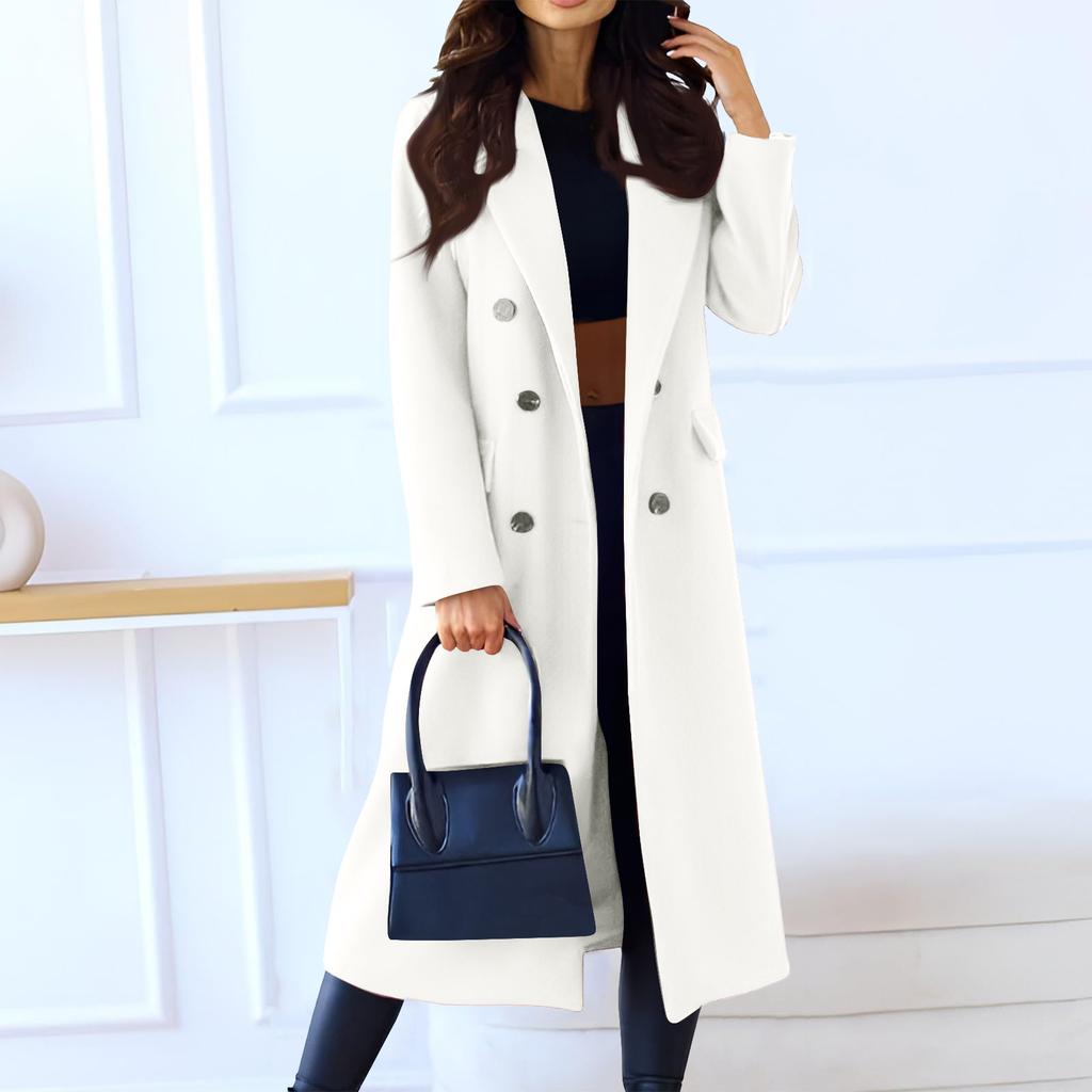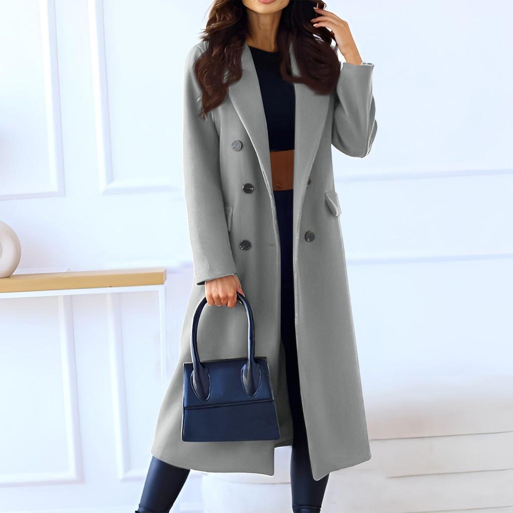 Женское модное повседневное длинное двубортное пальто однотонной расцветки из шерсти