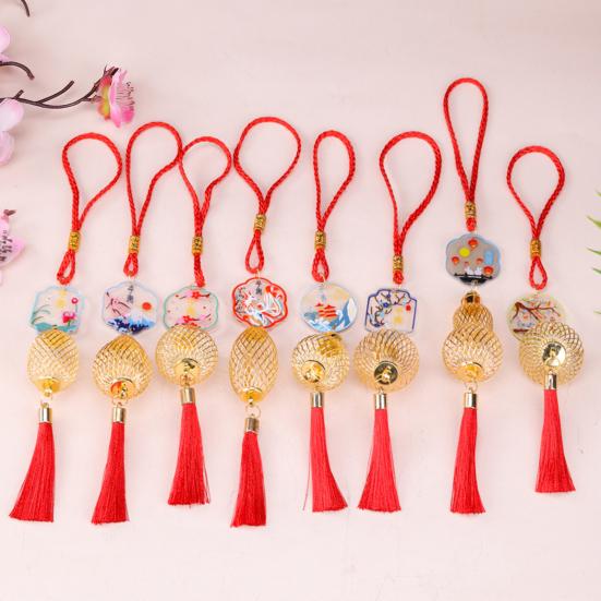 Отпразднуйте Новый год с этим изысканным новогодним подвесом, универсальным украшением, идеально подходящим для дверей, окон, столов и салонов автомобилей.. Изготовлено из высококачественного полого металла с дизайном фонаря и тыквы-горлянки, дополнено элегантными кисточками и изысканно детализированными подвесными бирками, что представляет собой изысканную альтернативу обычным пластиковым украшениям..