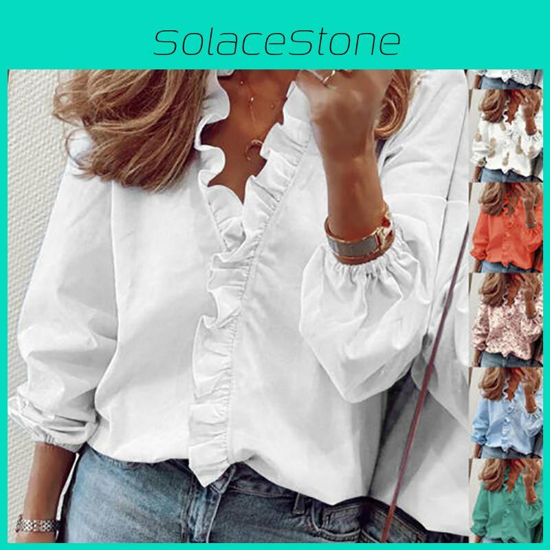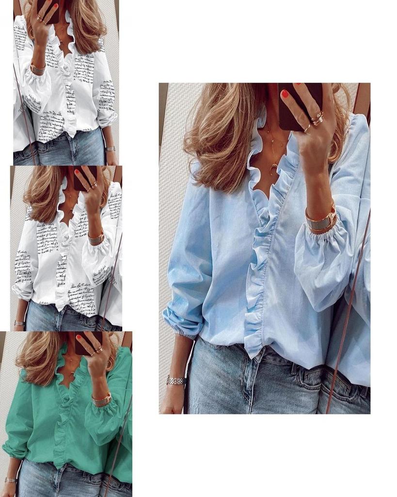 Элегантные женские блузки с длинным рукавом и оборками, V-образным вырезом и вариантами больших размеров