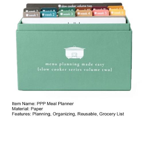 Планировщик питания PPP — это идеальный кухонный органайзер, разработанный для упрощения планирования питания и покупок продуктов.. Этот набор включает прочную, милую коробку для хранения ваших карточек с рецептами в безопасности и защиты от пролитых жидкостей и беспорядка.. Благодаря 12 неделям меню, включающим блюда из 5 ингредиентов или меньше, плюс основные продукты из кладовой, вы можете наслаждаться быстрыми, простыми и вкусными рецептами каждый день..