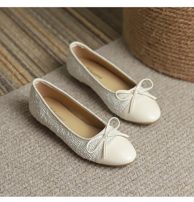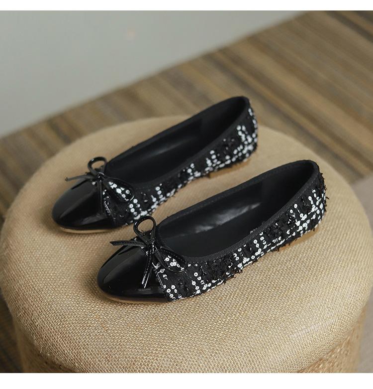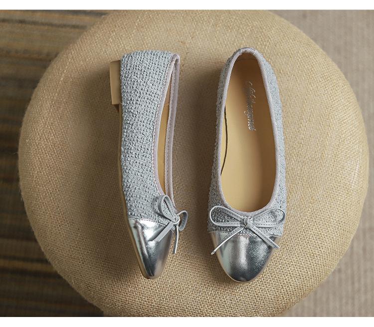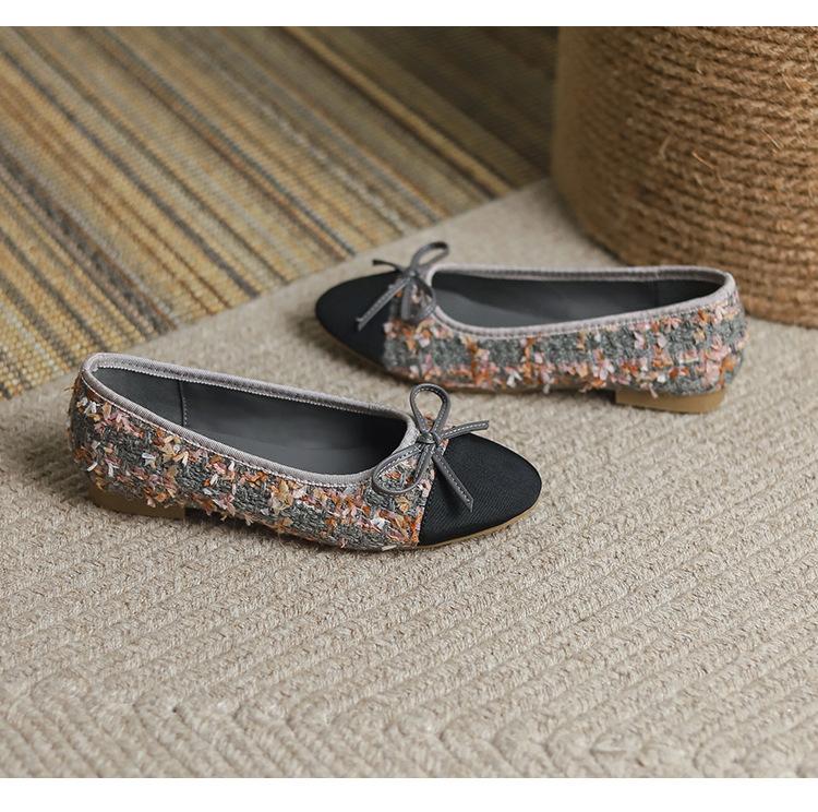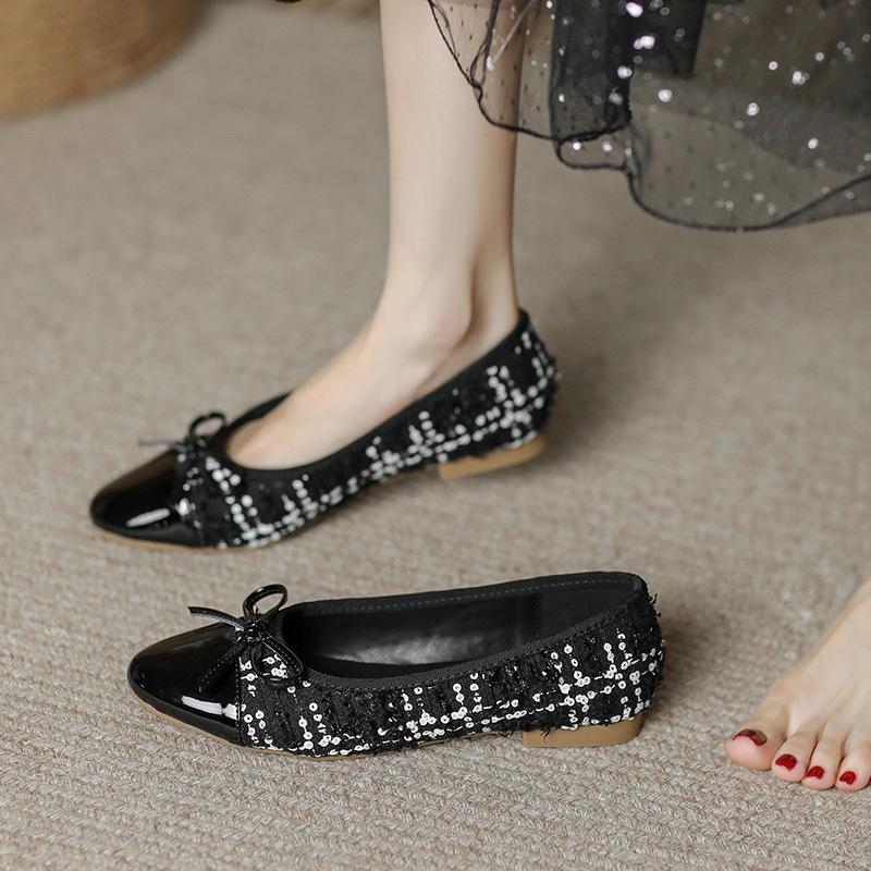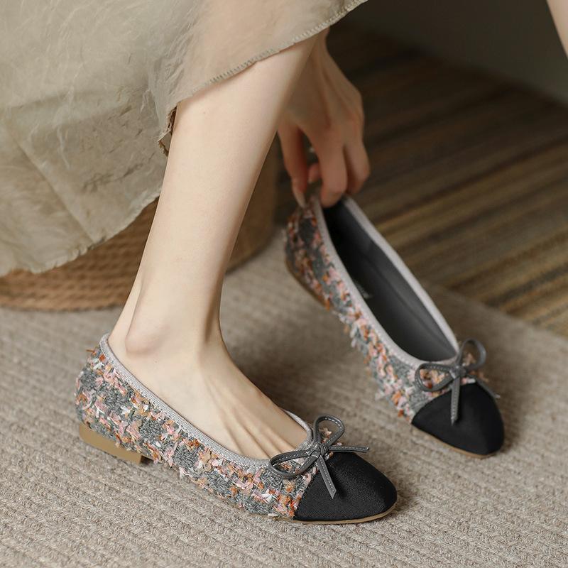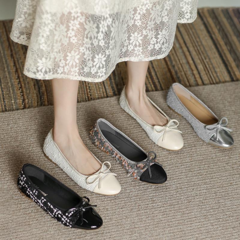 Модные удобные женские туфли Xiaoxiangfeng Ballet Flat Bottom Casual Single Shoes Women's 2024 New Lambskin Round Head Splice Bow
