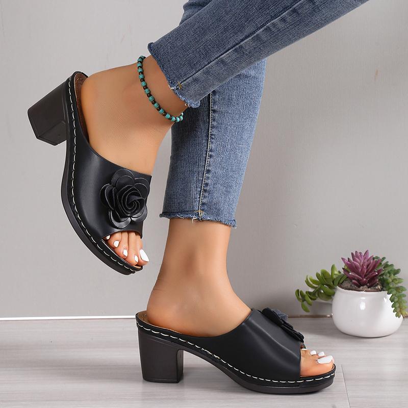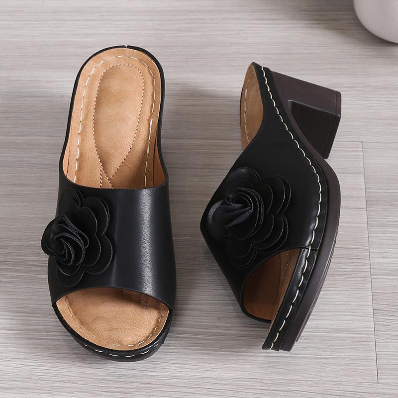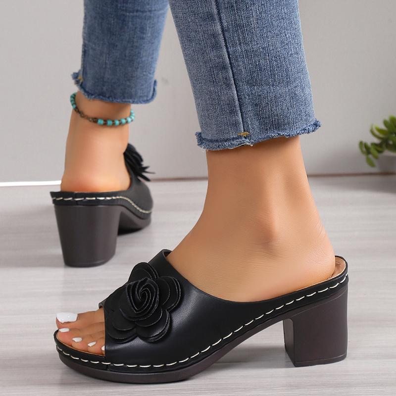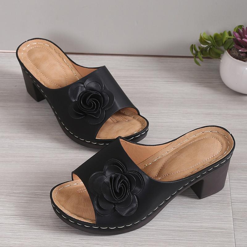 Мода 2024 Лето Новые Тапочки Женские Сандалии На Высоком Каблуке Женские Толстые Модные Тапочки Цветок Рыбий Рот Пляжные Тапочки Для Мам Черные
