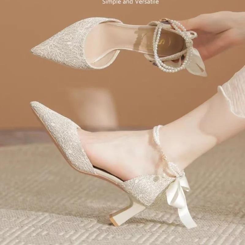 Модные новые летние туфли 2024 года, универсальные женские туфли на высоком каблуке с жемчугом, толстые каблуки, босоножки принцессы с бантом на высоком каблуке, туфли для вечеринки и свадьбы, большой размер