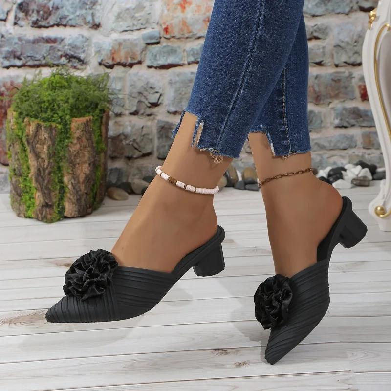 Модные летние женские тапочки, модные туфли Baotou на высоком каблуке, с острым носком, с квадратным каблуком, с цветочным декором, женская обувь