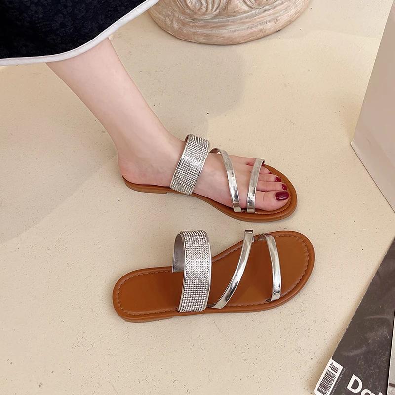Мода 2024 года, новые сандалии большого размера с открытым носком для женщин на лето в европейском и американском стиле, повседневные туфли на плоской подошве, пляжные сандалии со стразами