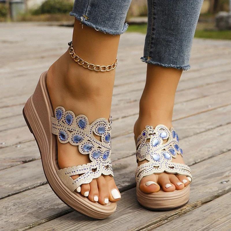 Мода 2024 Летняя женская обувь Высокое качество Большие размеры Модные женские пляжные туфли Высокие каблуки Тапочки со стразами