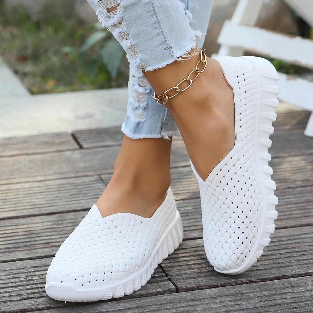 Мода 2024 года, плоская легкая модная плетеная женская обувь большого размера с мягкой подошвой для мам, спортивная обувь из ткани с выемками