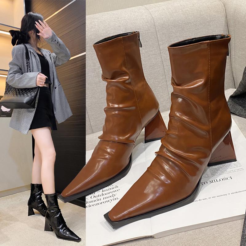 Модные новые ботинки до середины икры для женщин, остроносые, на тонком каблуке, современные ботинки, для улицы, вечеринки, уличный сексуальный стиль, однотонные ботинки, женская обувь