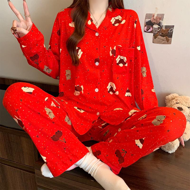 Новая красная мультяшная пижама с щенком женская весенняя новая имитация хлопка праздничная одежда для дома на год рождения комплект с длинным рукавом