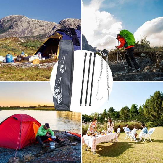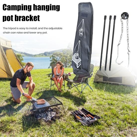 Универсальный дизайн штатива: Этот походный штатив оснащен прочной цепью из нержавеющей стали и обеспечивает точный контроль температуры при приготовлении пищи на открытом воздухе.. Его устойчивая конструкция штатива с регулируемыми настройками высоты позволяет настраивать сценарии использования, что делает его идеальным для кемпинга, барбекю, пикников и многого другого.