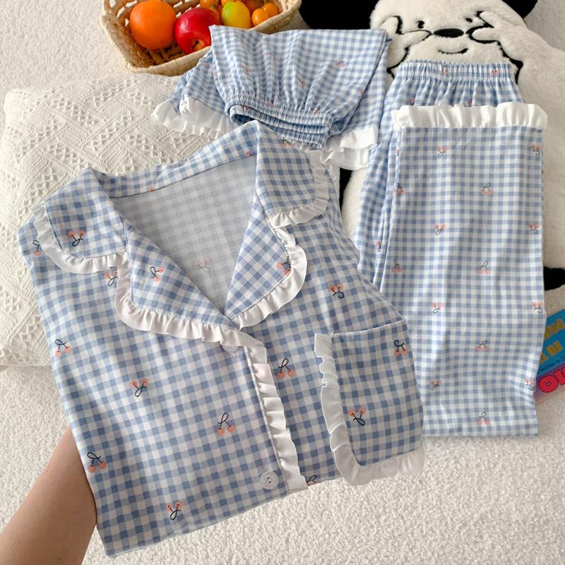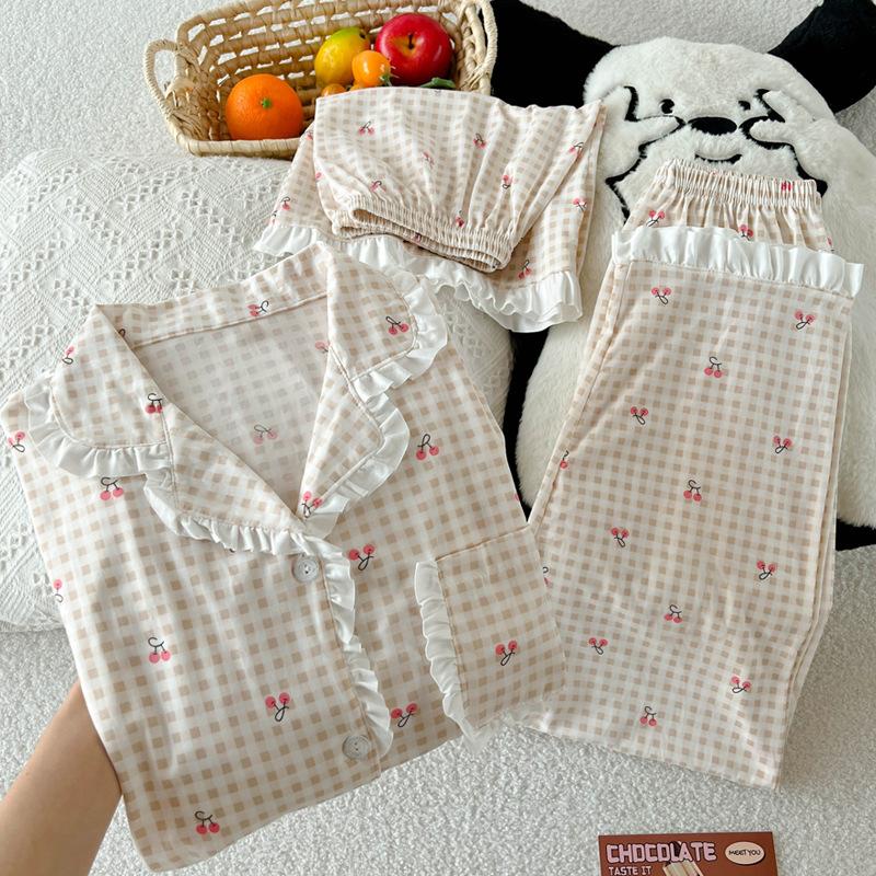 Милая маленькая вишневая клетчатая пижама с коротким рукавом женская летняя сладкая с оборками и листочками домашняя одежда комплект из трех предметов