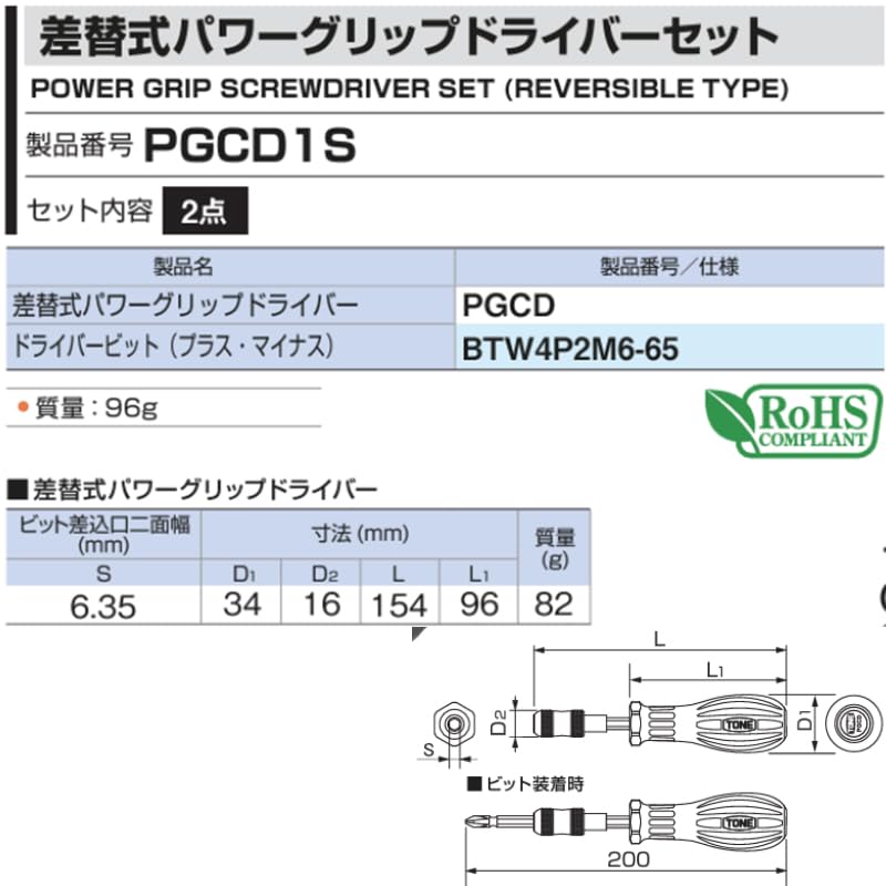 TONE PGCD1S Сменная силовая отвертка-рукоятка Включает набор из 2 штук, бита 6,35 мм, красно-черная,