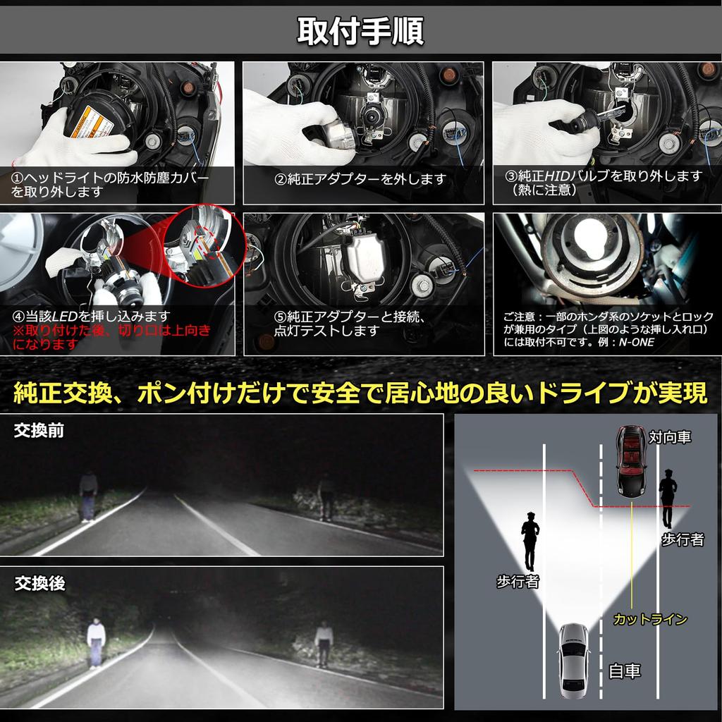 "Brighter than OEM HIDs, Instant Start" This LED is the culmination of over 10 years of research and is equipped with advanced, high-efficiency, high-quality LED chips. Compared to OEM HIDs, it emits significantly brighter light and provides a more evenly distributed light. Unlike HIDs, which gradually brighten, LEDs have the advantage of instantly reaching maximum light output after lighting up, providing maximum brightness quickly and ensuring safety in emergencies.