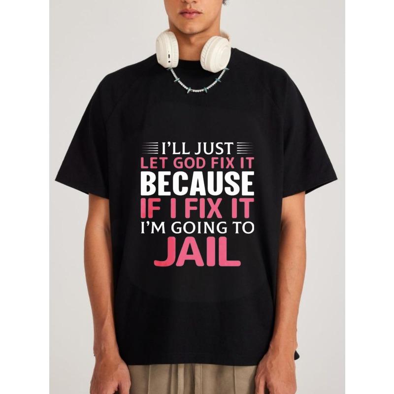 White T Shirt with I Ll Just Let God Fix It Because If I Fix It I M Going To Jail Print for Casual Wear — купить товар онлайн с бесплатной доставкой по всему миру!