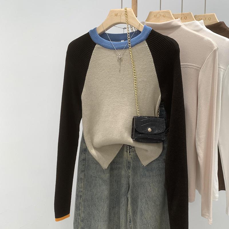 Цветной свитер с круглым вырезом, плечевым рукавом и облегающим кроем для женщин, осенне-зимний, с нишевым дизайном, уменьшающим возраст, модный внутренний топ