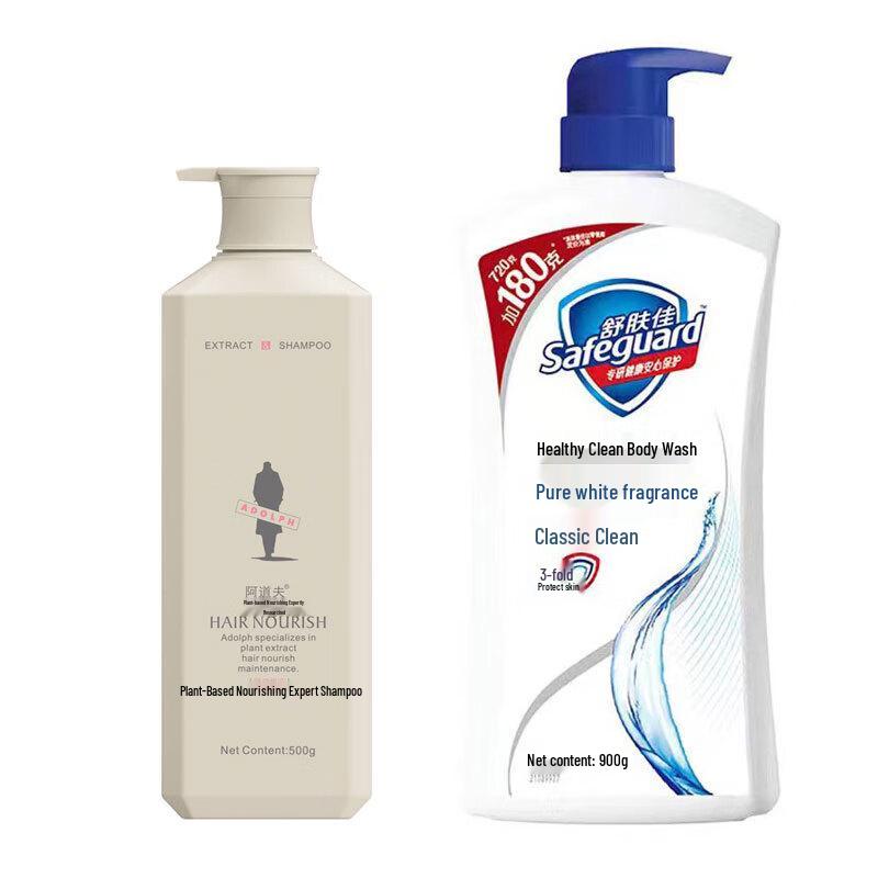This comprehensive hair and body care set includes Adolph Plant Extract Nourishing & Repair Shampoo (500g), formulated for normal hair, and Safeguard Pure White Fragrance Body Wash (900ml), suitable for various skin types. Both products offer a refreshing and gentle cleansing experience.