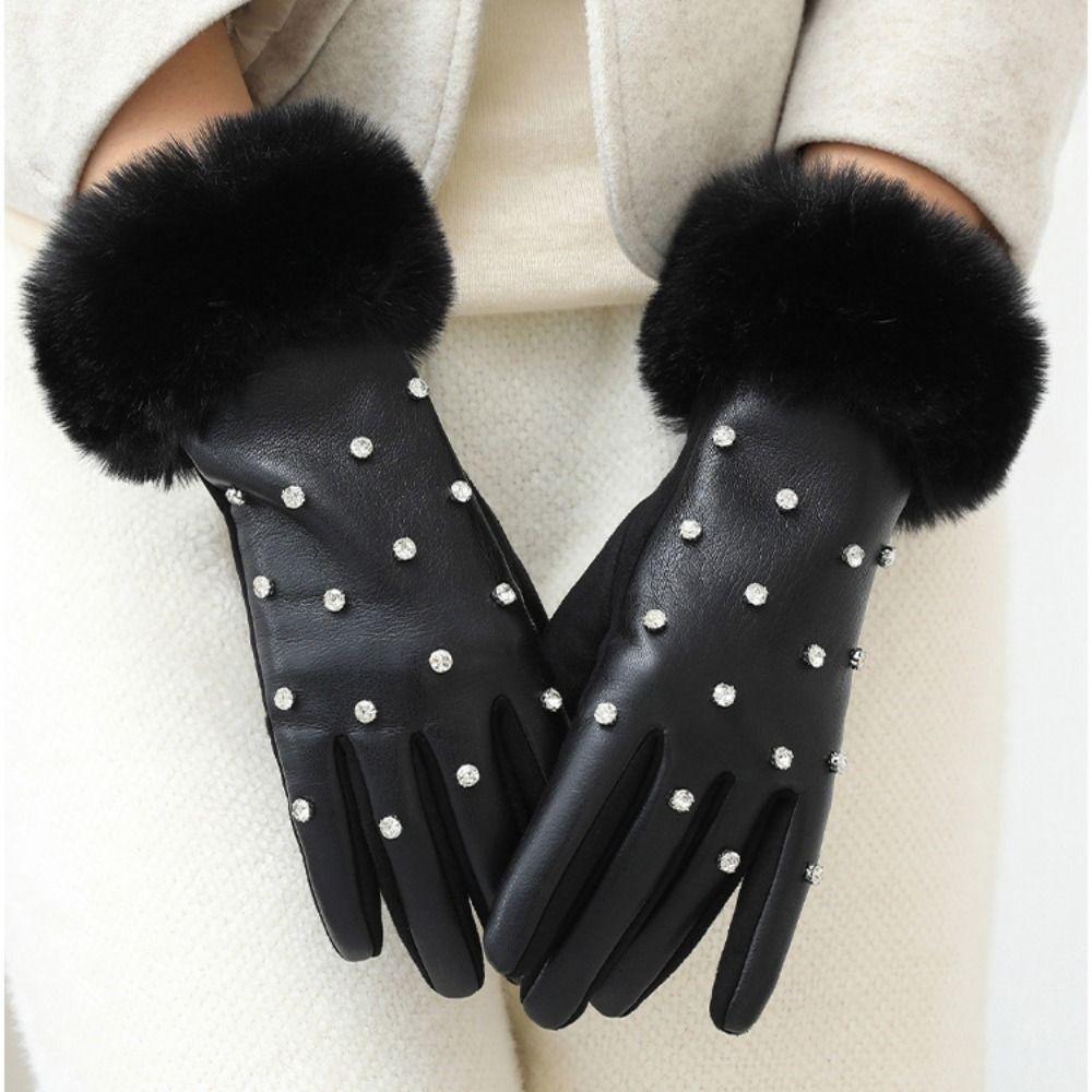 Бархатные перчатки со стразами, зимние, мягкие женские варежки, универсальные перчатки из ПУ кожи, осень