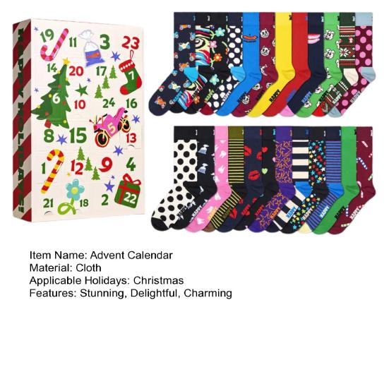 Раскройте дух праздника с нашим адвент-календарем, содержащим сюрприз-ассортимент рождественских носков. От классических принтов с Сантой и оленями до игривых рисунков снеговика и елки, эти чулки идеально подходят для обмена подарками или наполнения рождественскими мелочами.. Изготовленные из мягкого, дышащего материала, они обеспечивают комфорт в течение всего дня, будь то празднование дома или с семьей..