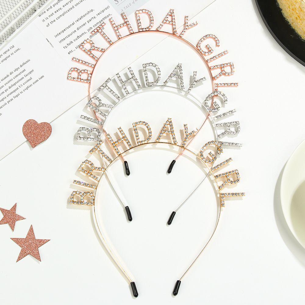 Тонкий металлический сплав обруч для волос, цвет металлик, имитация мерцания хрусталя страз "День рождения" украшения с заглавными буквами, 3 цвета опционально.