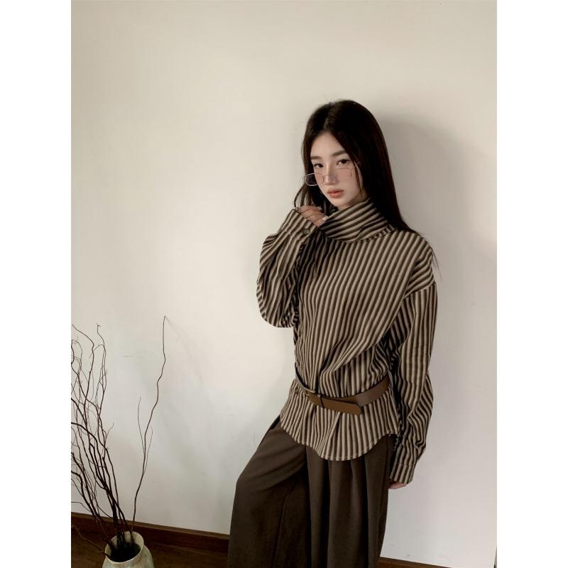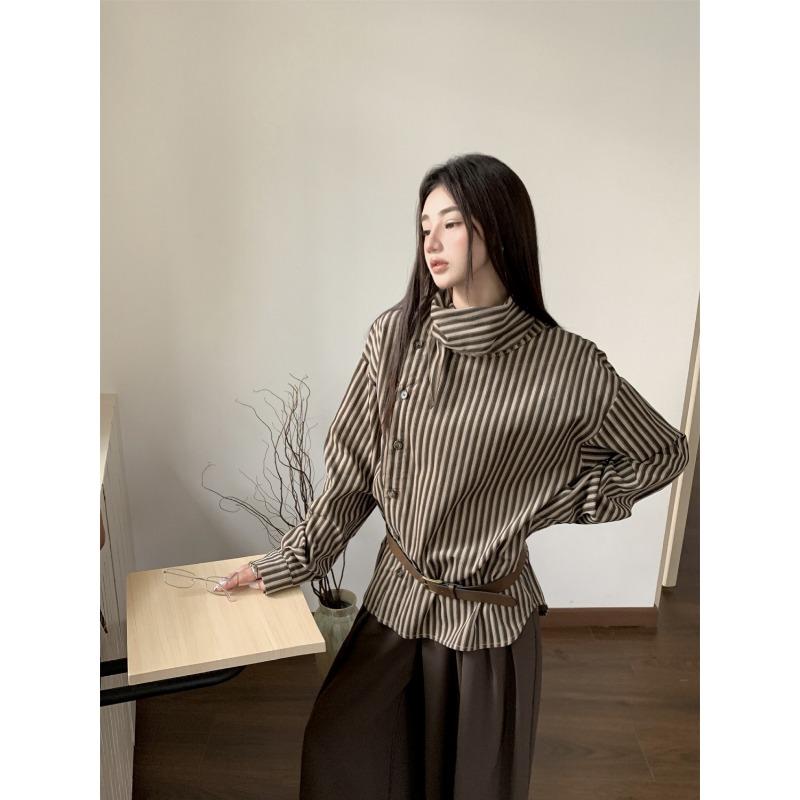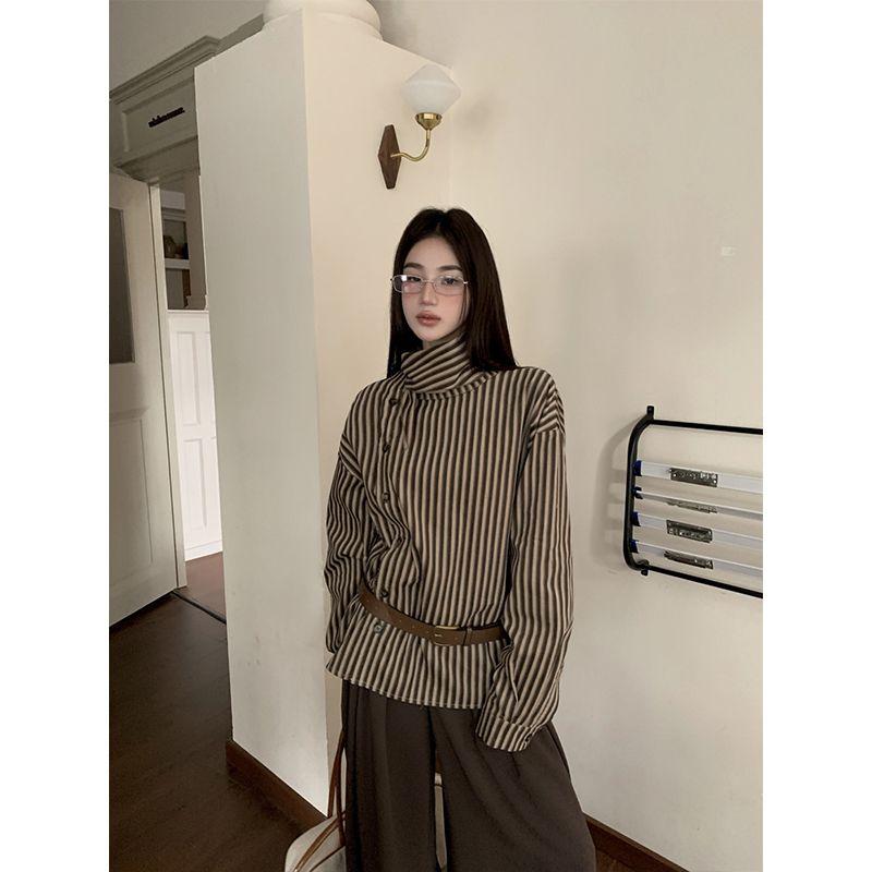 Женская рубашка в полоску с длинным рукавом и диагональной планкой во французском стиле, новый корейский универсальный топ с полувысоким воротником