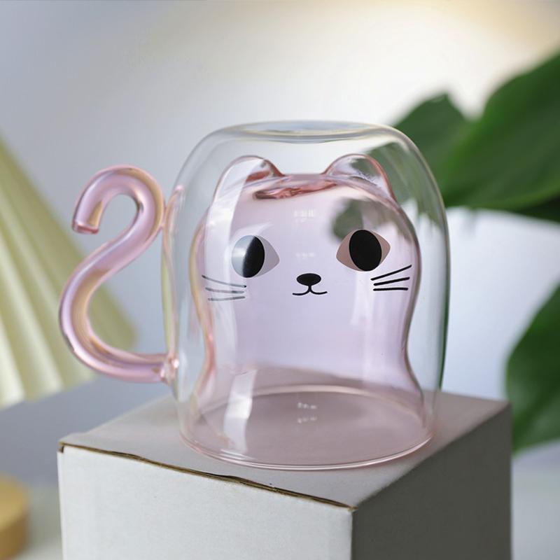 Creative Cute Cat Double-layer Coffee Mug Cartoon Couple Teacup Insulated Glass Mugs With Handle Household Office Drinkware
