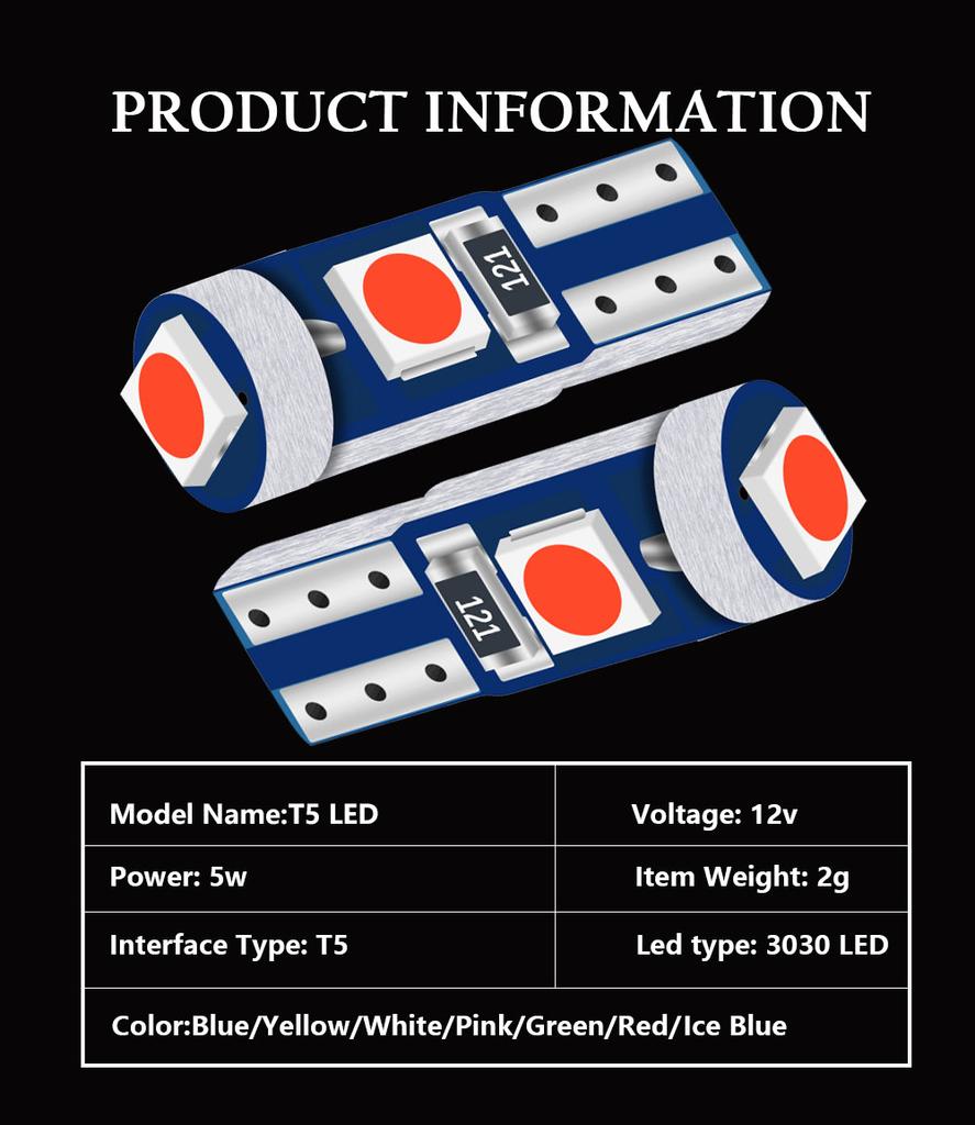 10Pcs T5 LED Lights W1.2W W3W LED Super Bright 3030 LED Car Interior Light Auto Side Wedge Dashboard Gauge Instrument Lamp Bulb