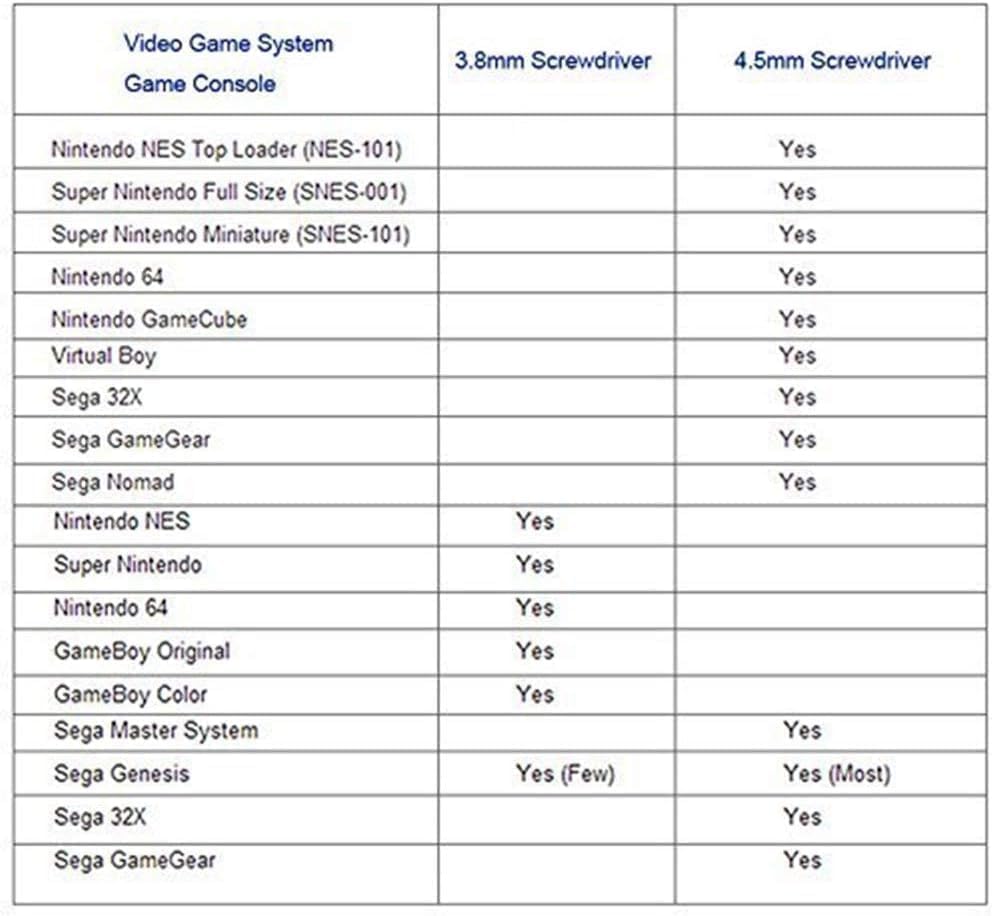 Compatible with 4.5mm bit: NES-101, SNES-001, SNES-101, 64, Game Cube; Sega Master System, Sega Genesis System, Sega 32x System game cartridge; Virtual Boy, Game Gear.