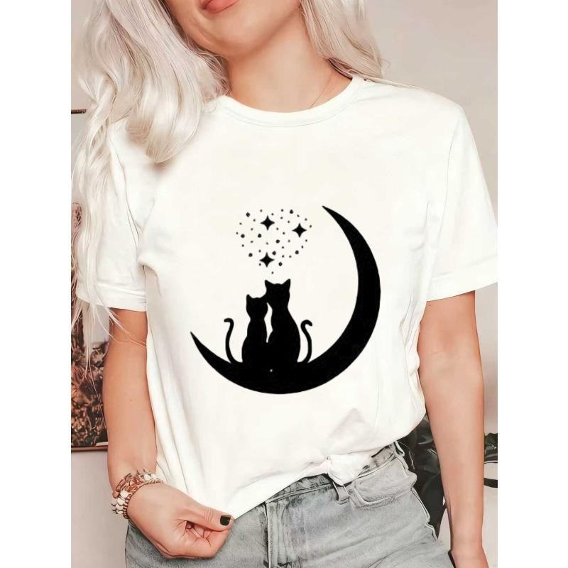 Черная футболка оверсайз с принтом кошек на луне для повседневной носки