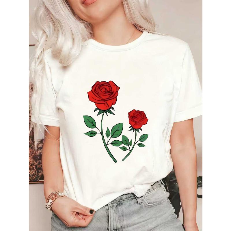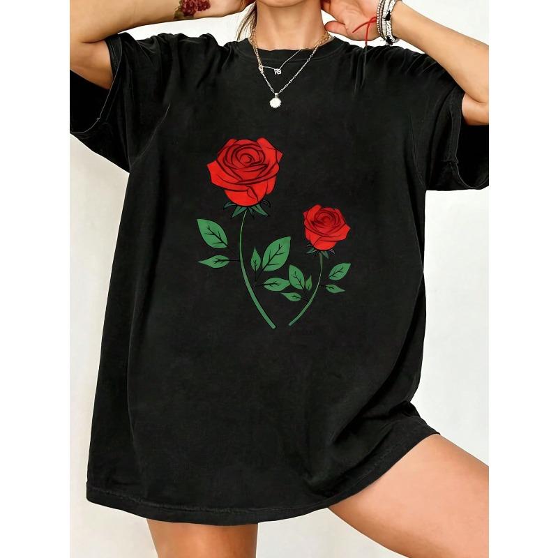 Черная футболка оверсайз с принтом красной розы для повседневной носки