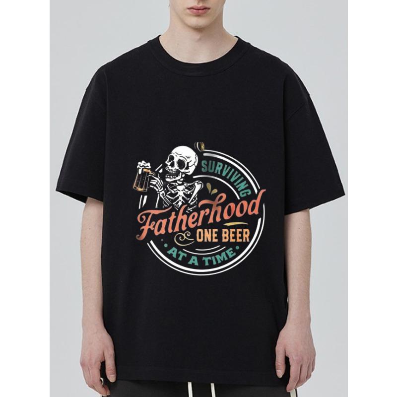 Мужская футболка Черный скелет держит пиво Выживая в отцовстве по одному пиву за раз Графический принт Повседневная одежда на День отца или для повседневной носки