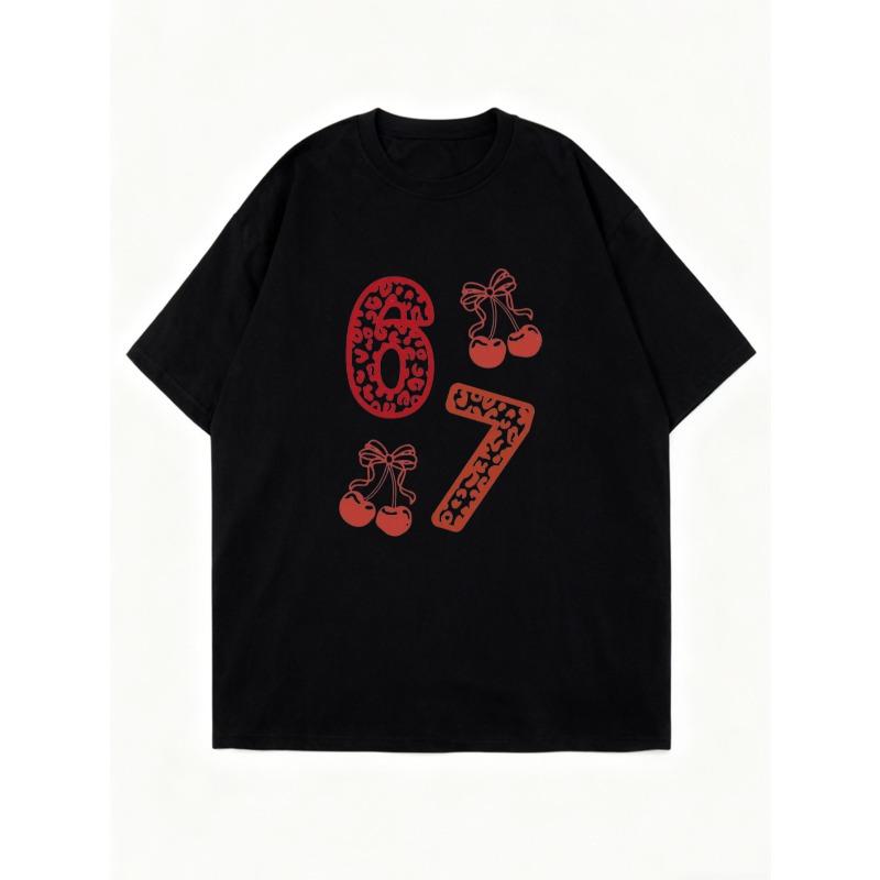 Футболка оверсайз черного цвета с леопардовым принтом, графический принт с цифрами и вишнями для повседневной носки и уличного стиля