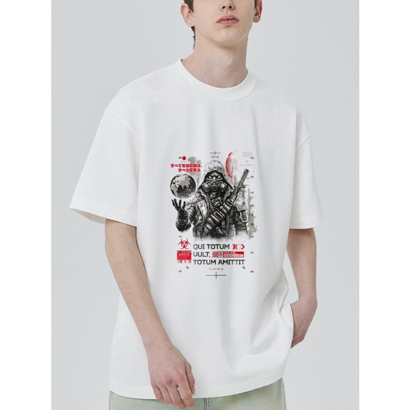 White T Shirt with Astronaut and Weapon Graphic Print and Latin Text for Casual Streetwear Style