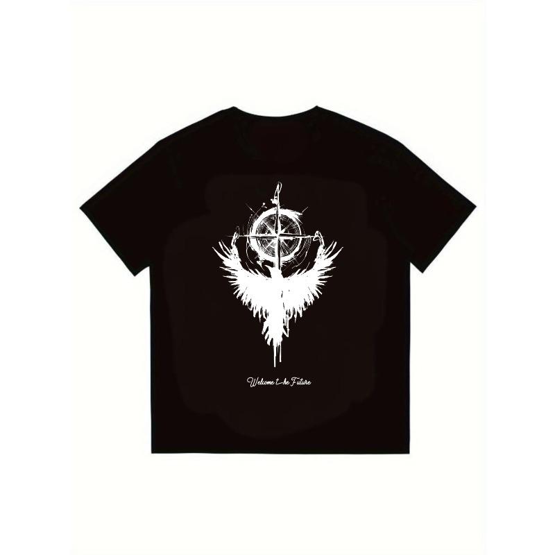 Черная футболка с белыми крыльями ангела, дизайном компаса и текстом «Добро пожаловать в будущее» для повседневной уличной моды