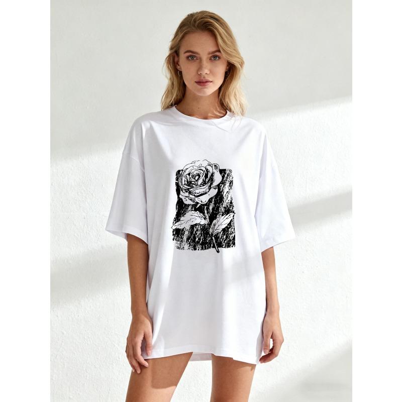 Футболка оверсайз с принтом черной розы, графическая футболка в стиле кэжуал стритвир для женщин, летний наряд
