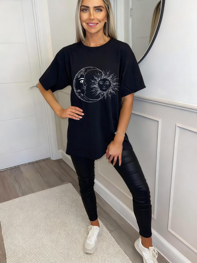 Черная футболка оверсайз с принтом лица луны и солнца для повседневной носки