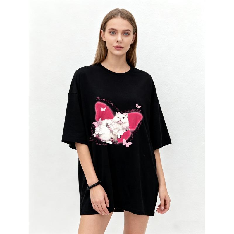 Oversized T Shirt Black Cat With Pink Wings And Butterflies Print For Casual Wear — купить товар онлайн с бесплатной доставкой по всему миру!
