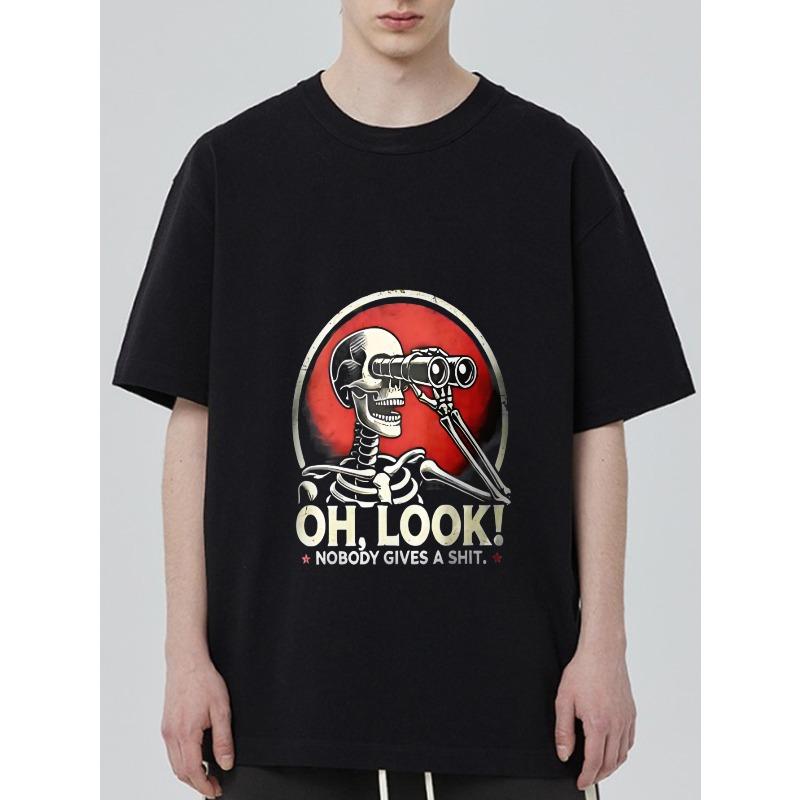 Черная футболка с графическим дизайном «Скелет с биноклем. О, смотрите, всем плевать» для повседневной носки — купить товар онлайн с бесплатной доставкой по всему миру!