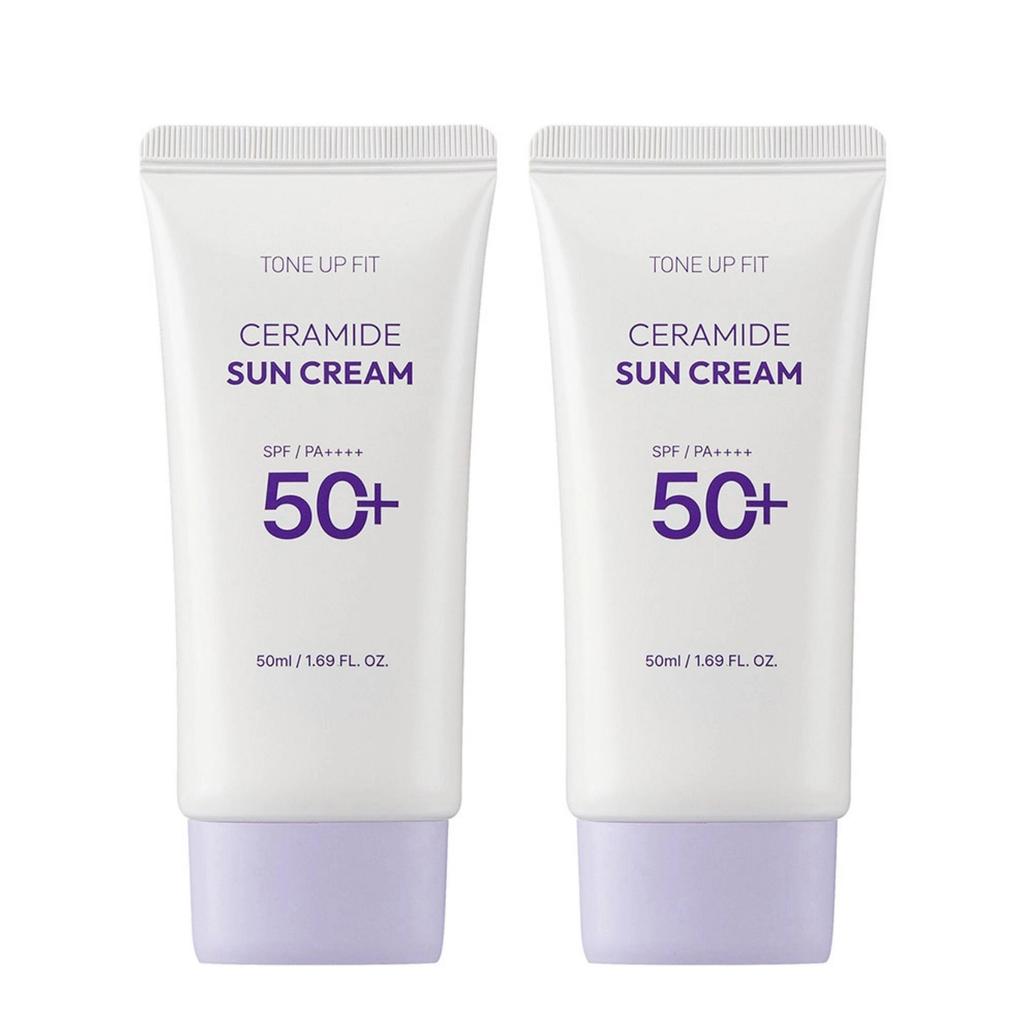 Charmzone Tone-Up Fit Ceramide Sun Cream is a brightening, skin-protecting sunscreen designed to deliver strong UV defense while providing a natural tone-up effect. Infused with Ceramides, it helps strengthen the skin barrier and maintain long-lasting moisture, leaving the complexion smoother and more radiant. The lightweight texture blends evenly without white cast or dryness, making it ideal for daily use on all skin types. This value set includes two full-size 50ml tubes.