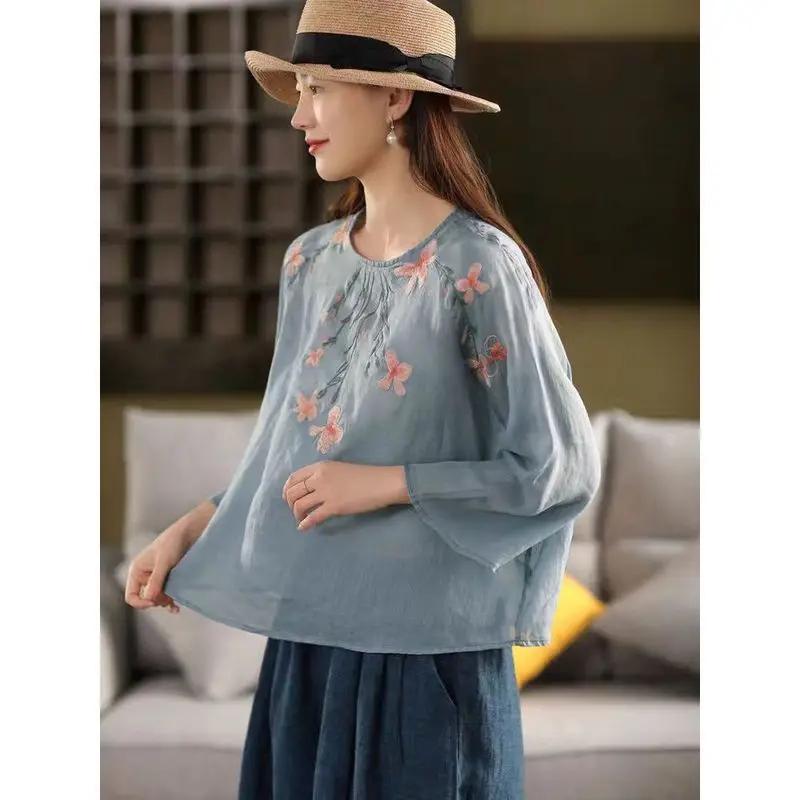 Футболка с круглым вырезом для лета Новая свободная тонкая универсальная футболка Литературный вышитый пуловер из хлопка и льна
