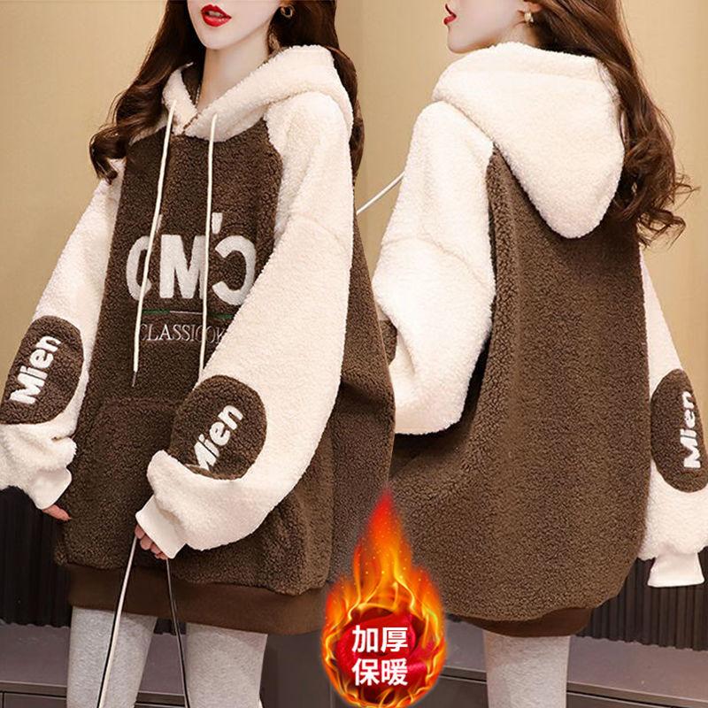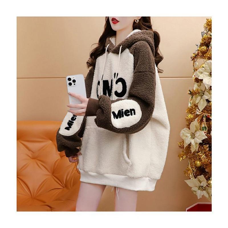 Толстовка с капюшоном из овечьей шерсти с добавлением бархата для женщин 2025 Новая осенне-зимняя средней длины в корейском стиле свободного дизайна