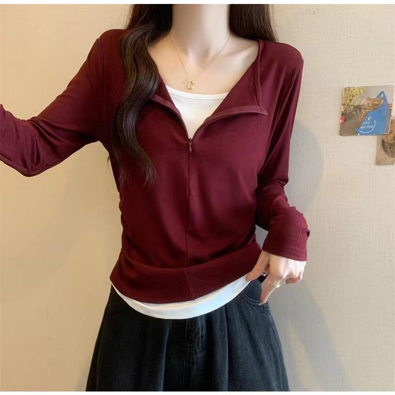 Женская футболка с длинным рукавом на молнии, имитирующая двойку, облегающего кроя, верхняя одежда, новая базовая футболка, топ в корейском стиле, осень — купить товар онлайн с бесплатной доставкой по всему миру!